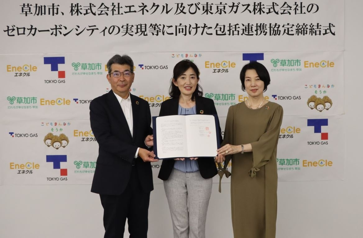 左から エネクル代表取締役社長:堀川 雅隆、草加市長:山川 百合子、東京ガス常務執行役員:小西 雅子