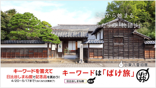 また、島根県のアンテナショップ「日比谷しまね館」との連携企画として、動画広告内に映し出されたキーワード「ばけ旅」を「日比谷しまね館」で答えると、記念品がもらえるプレゼントキャンペーンをあわせて実施しています。