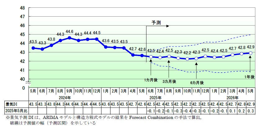 景気予測DIは、ARIMAモデルと構造方程式モデルの結果をForecast Combinationの手法で算出。破線は予測値の幅(予測区間)を示している