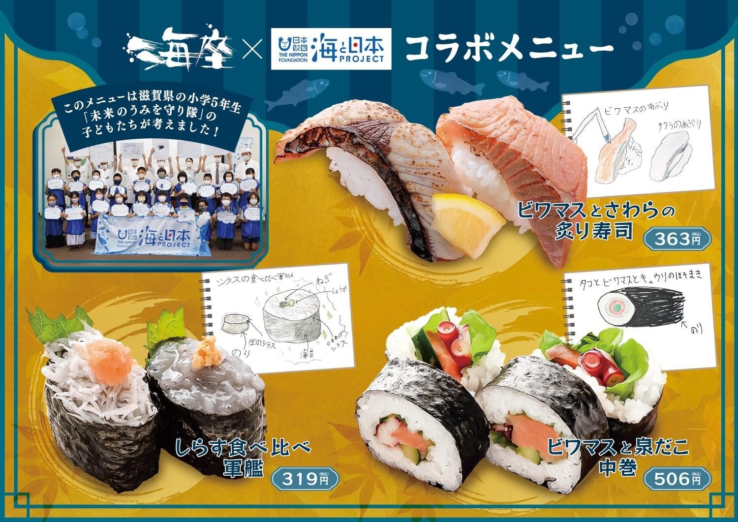海と日本プロジェクトin滋賀県実行委員会は、滋賀県と福井県で回転寿司「海座(うみざ)」などを展開する株式会社ファイブスター(本部:滋賀県彦根市)の協力のもと、海座×海と日本プロジェクトコラボメニュー「大阪湾と琵琶湖の幸」の販売を企画しました。この企画は、次世代へ海を引き継ぐために、海を介して人と人とがつながる“日本財団「海と日本プロジェクト」”の一環で実施しています。