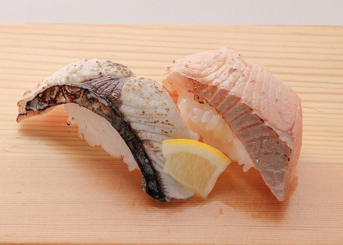 もみじ鯛梅肉のせ 319円 / 天然さわら味噌マヨ炙り319円 / 海・びわ湖の幸三貫盛473円