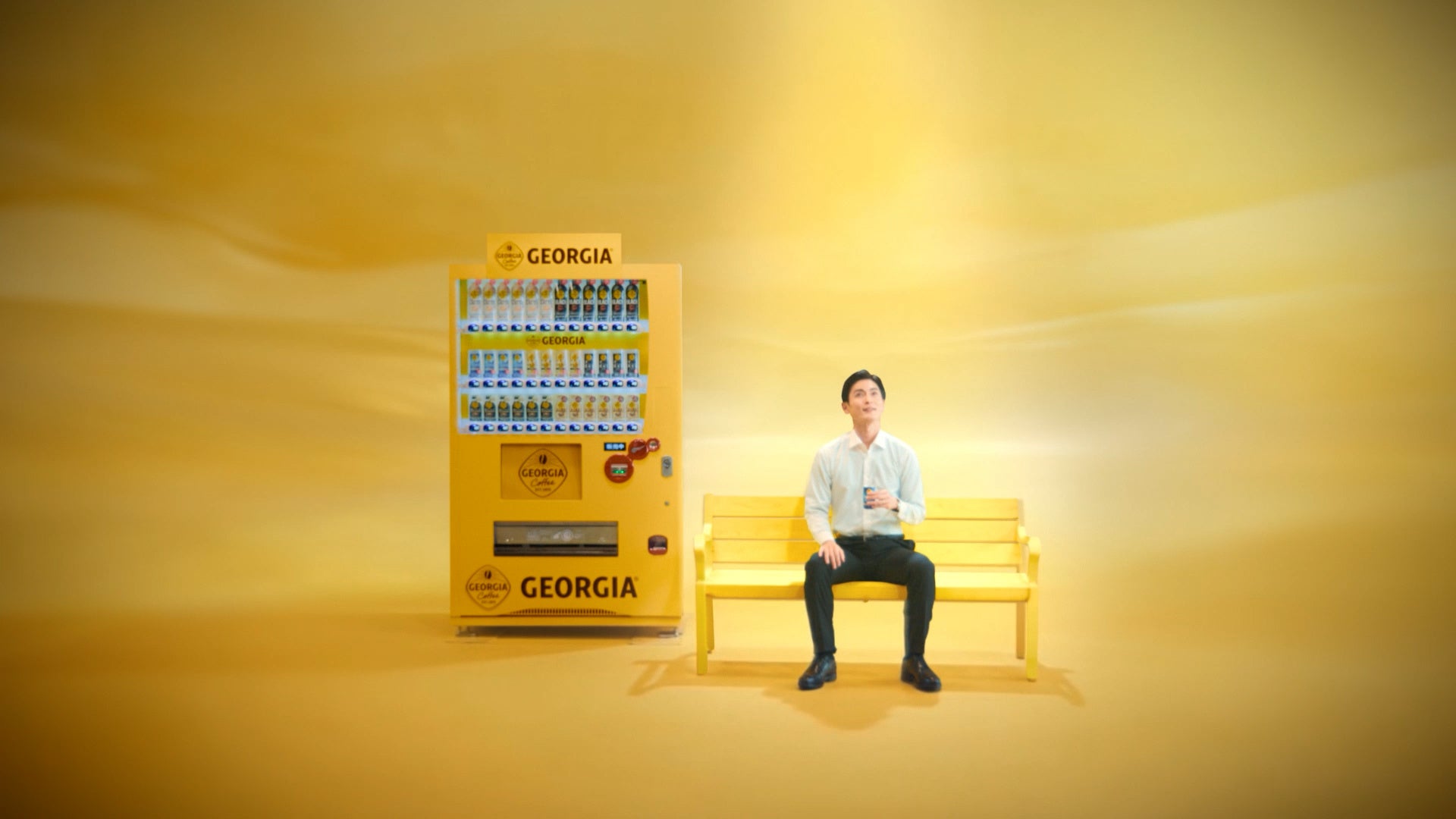 「ジョージア」は、ブランドカラーのイエローでラッピングした自動販売機およびベンチの展開を順次開始します。CM本編で高良健吾さんが休憩するシーンに登場する黄色い自動販売機とベンチをリアルな場で再現し、サービスエリアやガソリンスタンドなどを中心に設置。一部ガソリンスタンドでは製品サンプリングも実施します。 本取り組みを通じて、「ジョージア」は働く人の良質な休憩に寄り添うコーヒーブランドとしての価値と、前向きに挑戦を続ける人々の背中を後押しするコーヒー体験をお届けしてまいります。
