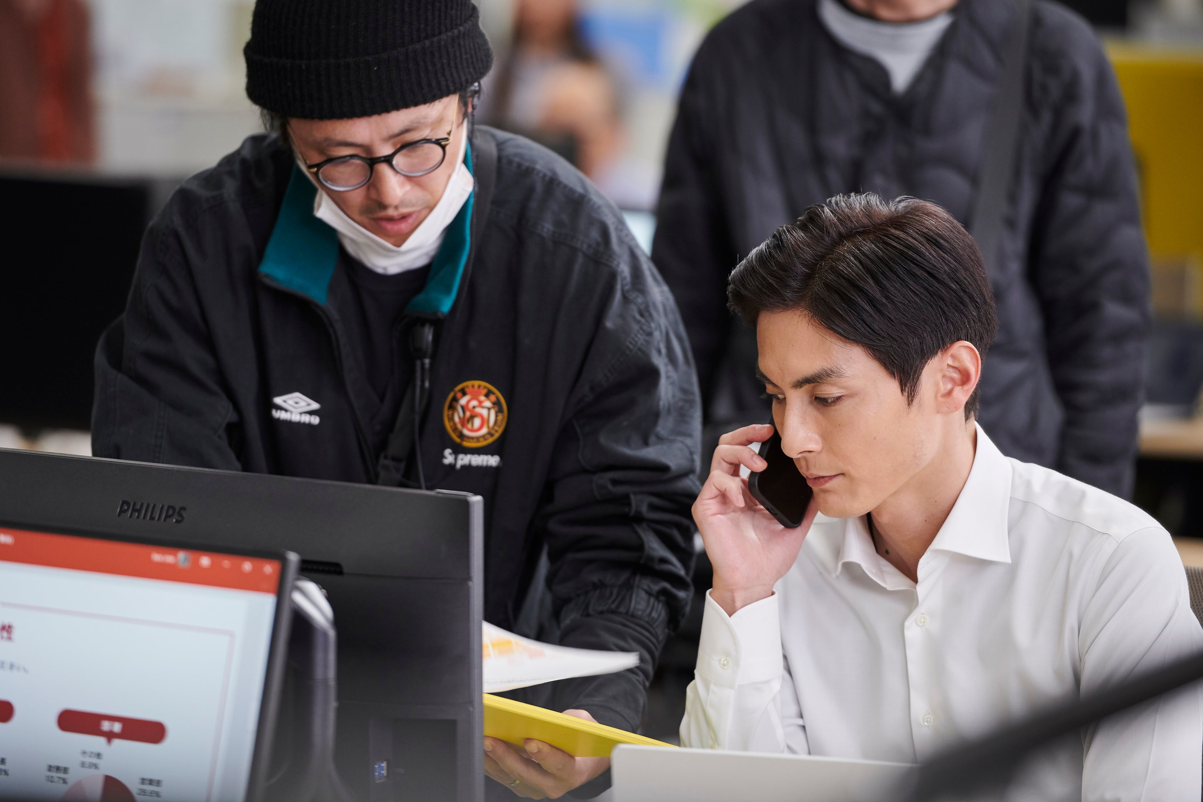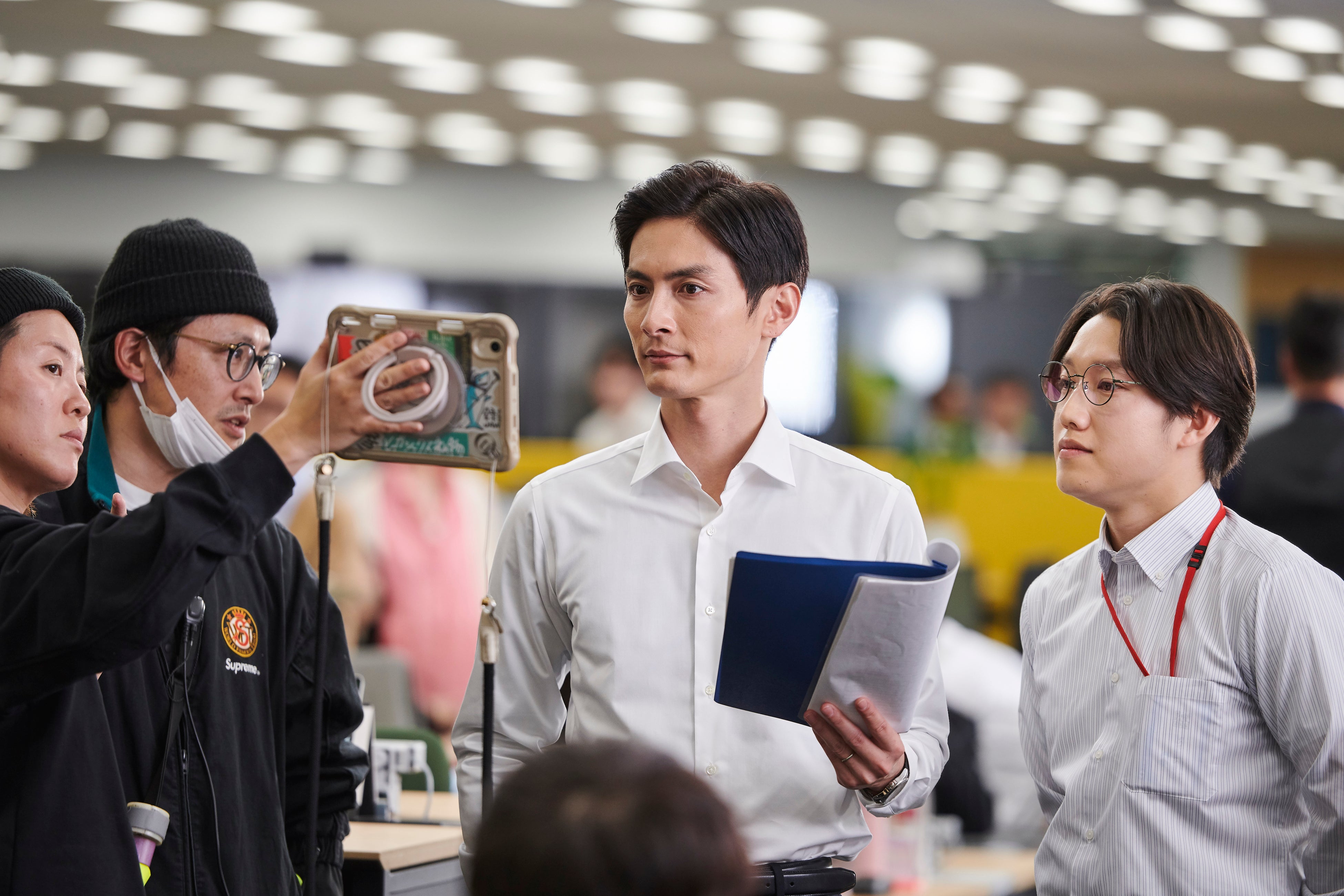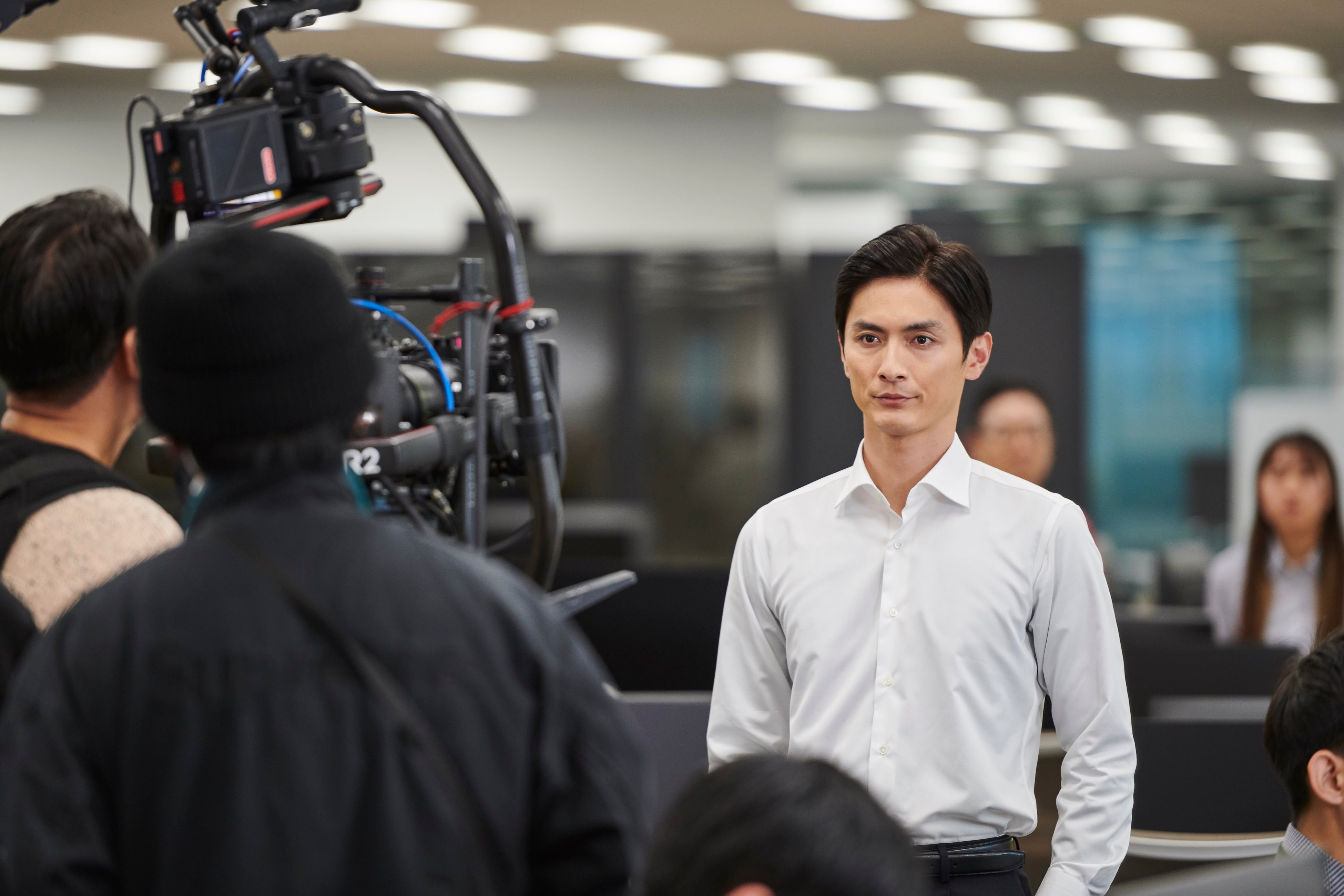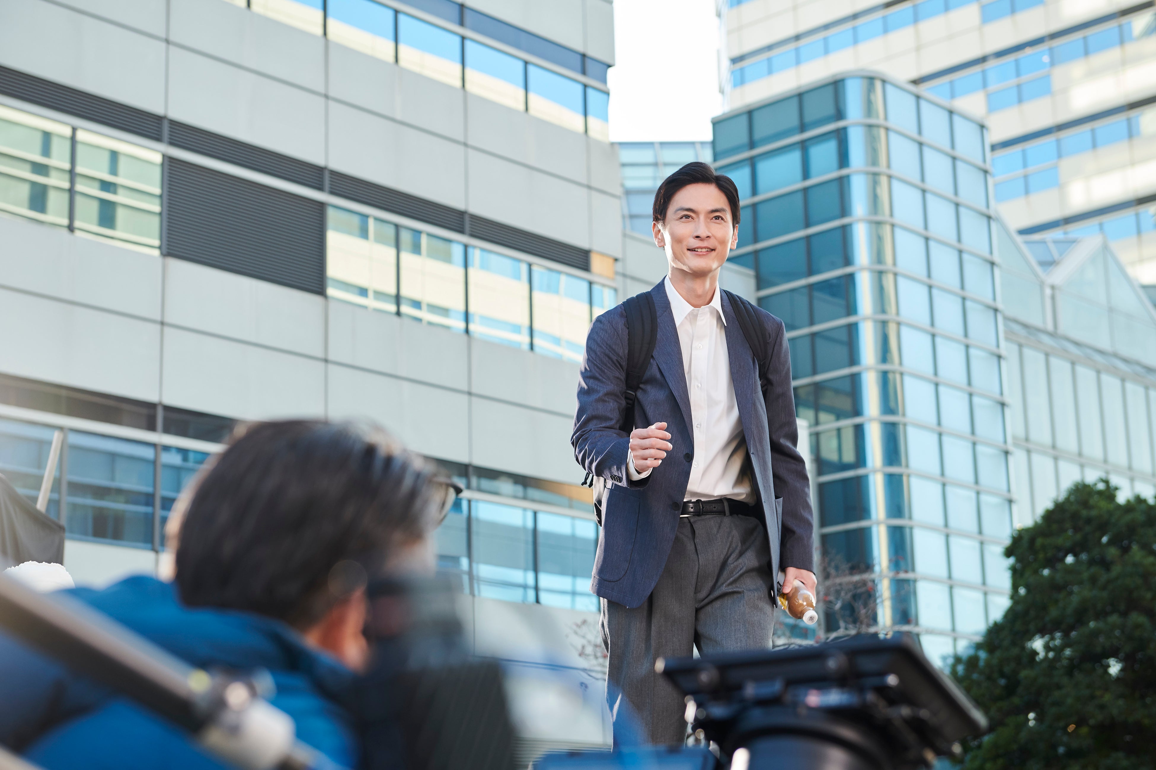 オフィスを颯爽と歩き抜けるシーンでは、カットがかかる度に誰よりも早くモニターの前へ向かい、撮影した映像を入念にチェックしていた高良さん。シーンごとに表情の変化や声のトーンを細かく確認しながら丁寧に撮影に挑む、俳優としての真摯な姿勢が光っていました。