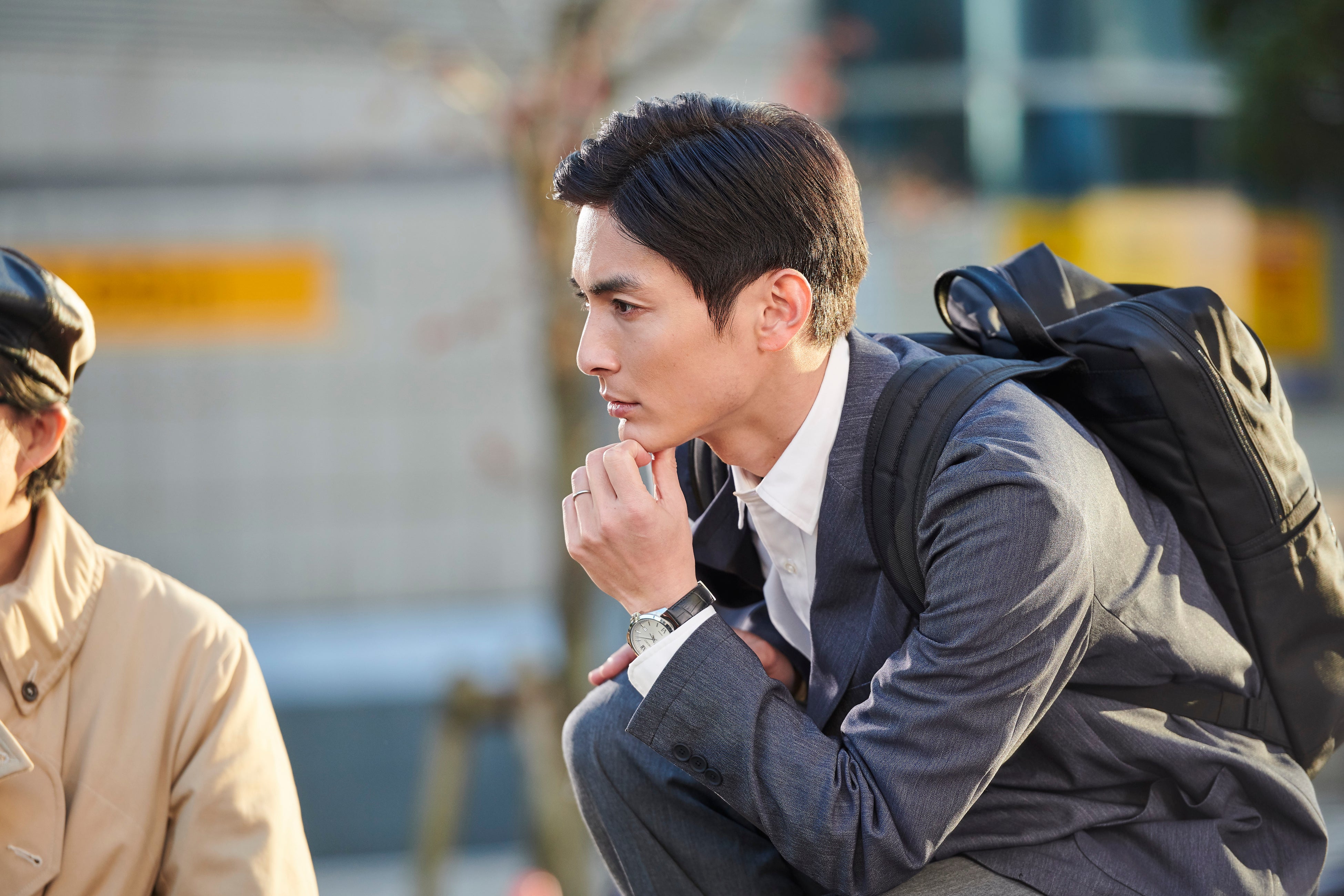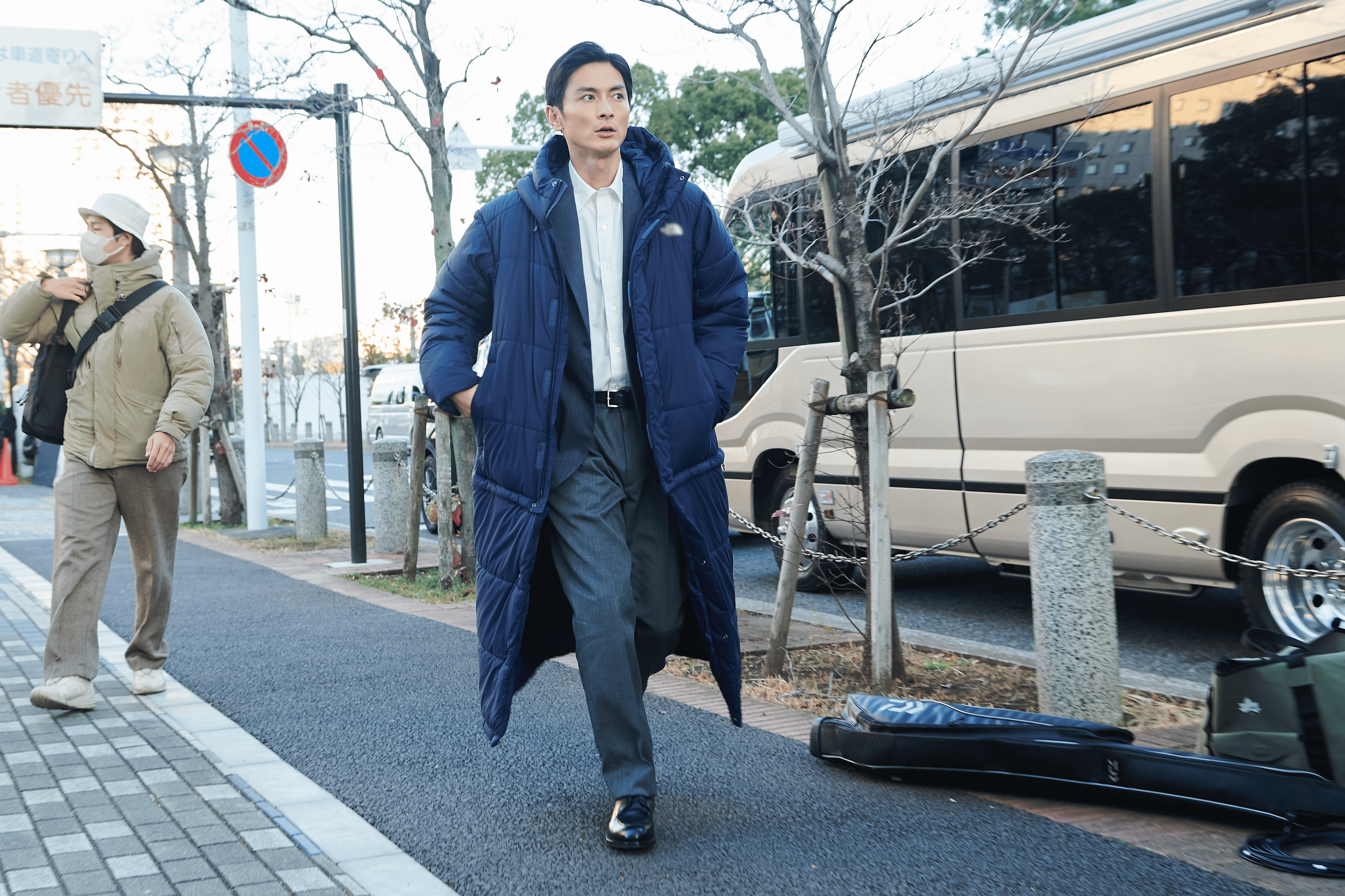 空気の冷え込む早朝、スーツ姿で撮影現場に現れた高良健吾さん。寒さを感じさせない穏やかな表情で撮影をスタートしました。