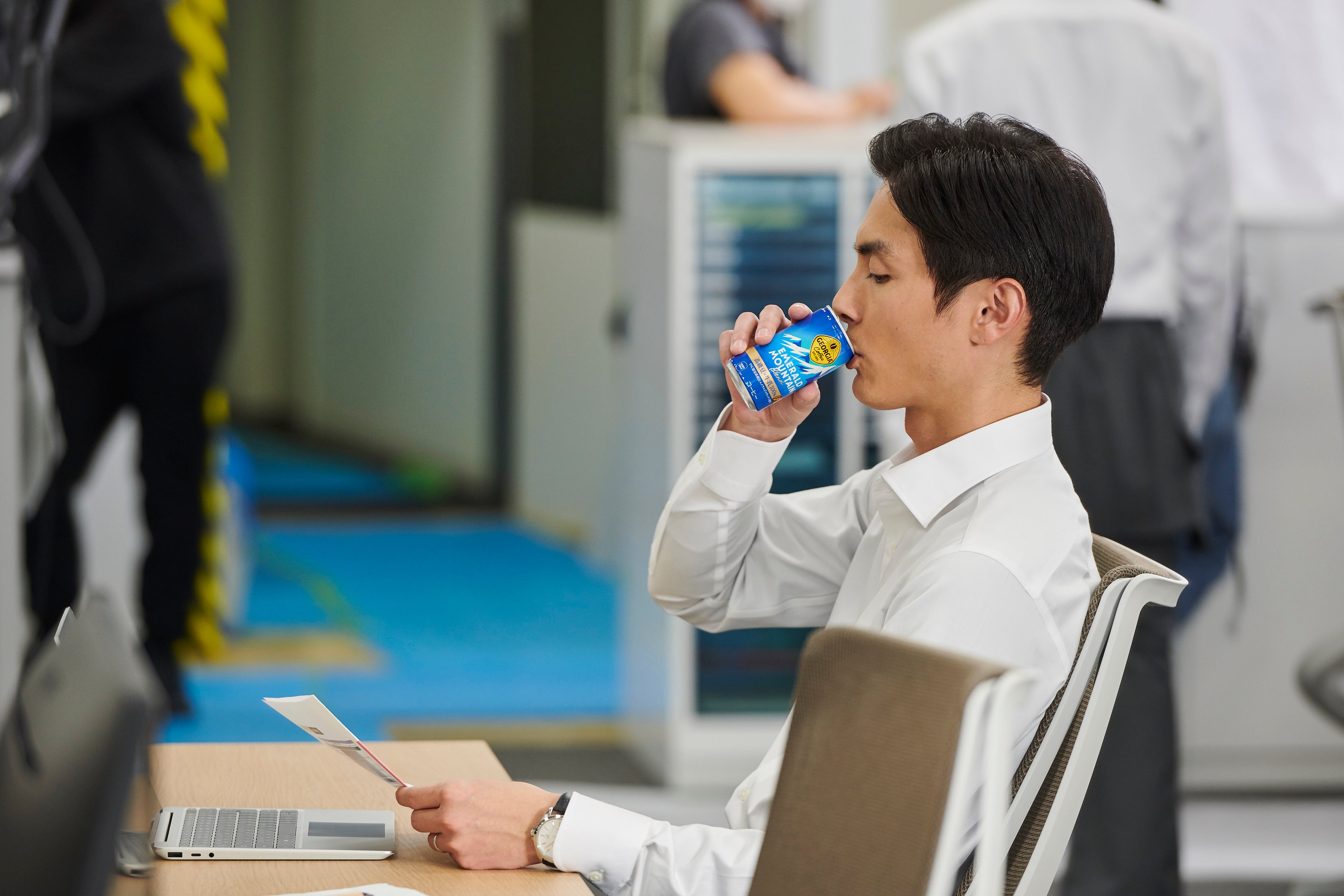 「ジョージア」の缶コーヒーを飲みながらリラックスする様子を見せてくれました。