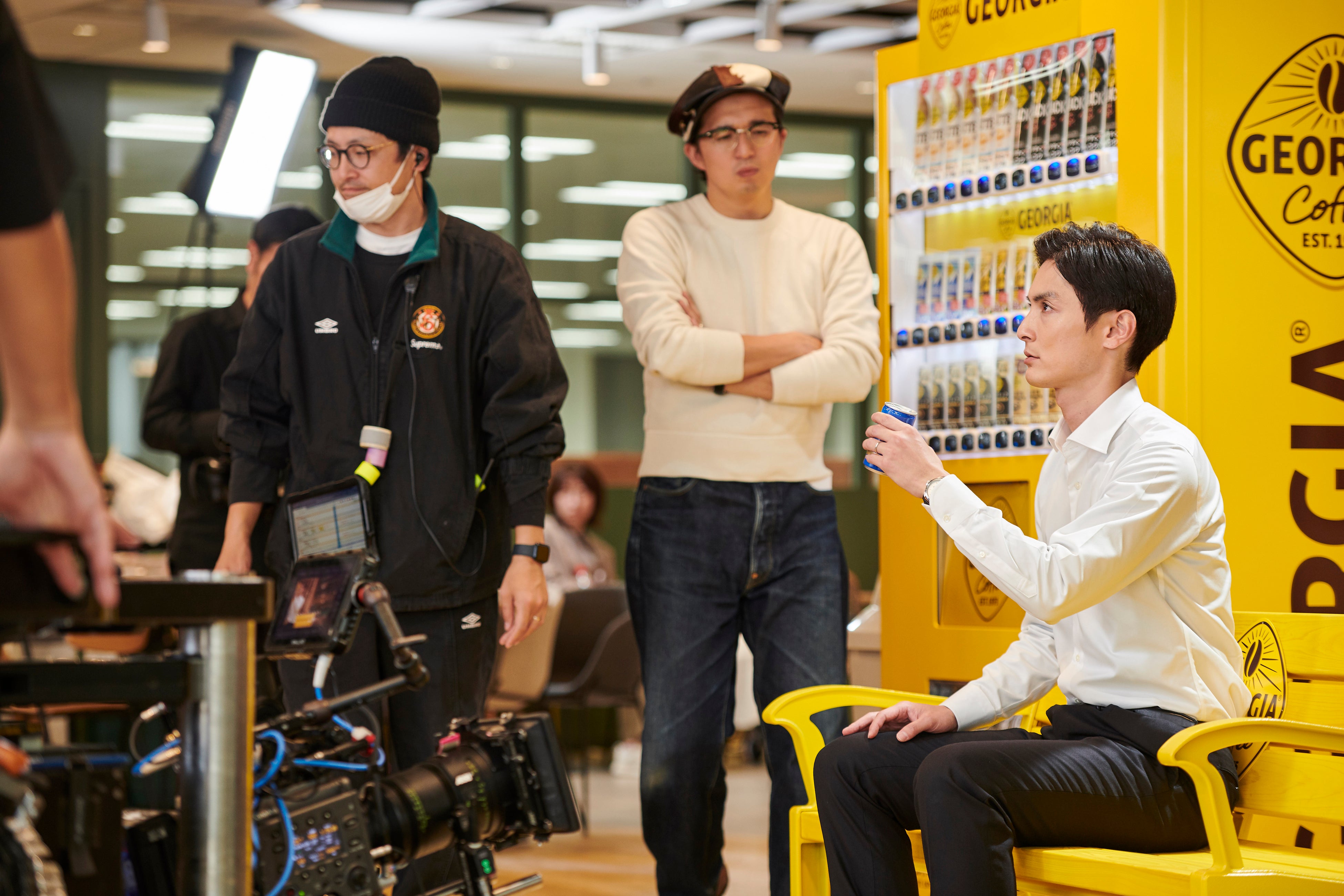 「ジョージア」カラーのベンチに座り「ジョージア エメラルドマウンテンブレンド」を飲むシーンでは、缶コーヒーの香りに思わず微笑みを浮かべたり、一口飲んでほっと一息ついたりしながら、時には高良さん自ら手を挙げて監督に缶の動きを相談する場面も。休憩時間に手軽にリフレッシュできる缶コーヒーの魅力を伝えるため、長丁場の撮影にもかかわらず最後まで真摯に演技に向き合う姿が印象的でした。