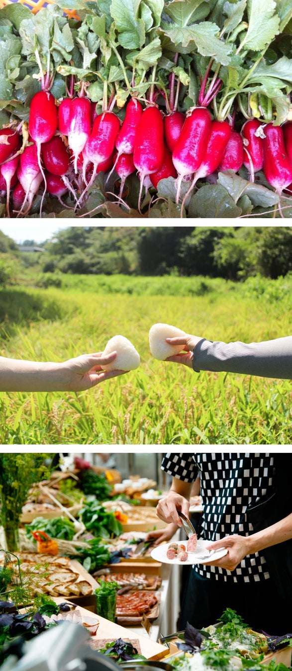 「つながる・まなぶ」野菜のたねをオンラインで栽培キットとして事前販売し、育てる体験を通して作り手を想像する「未来につなぐ、たね」。フェス当日は農場長から直接アドバイスを受けることができ、収穫後においしく食べるレシピもシェフからお伝えします。会場では収穫体験やワークショップで作り手とつながり、新たな食の発見や学びにふれる9つのプログラムをご用意。感謝の乾杯をおにぎりで行う「おにぎりで1000人とつながろう」。現代美術家・淺井裕介さんと共に、園内の道に描き出すアートの制作体験。鶏やサーモンが美味しい料理になるまでの一連を知り「いただきます」の本当の意味を考えるワークショップ(事前予約制)。また、開墾中の棚田で収穫されるお米の将来を考える「投票所」が会場内に出現します。