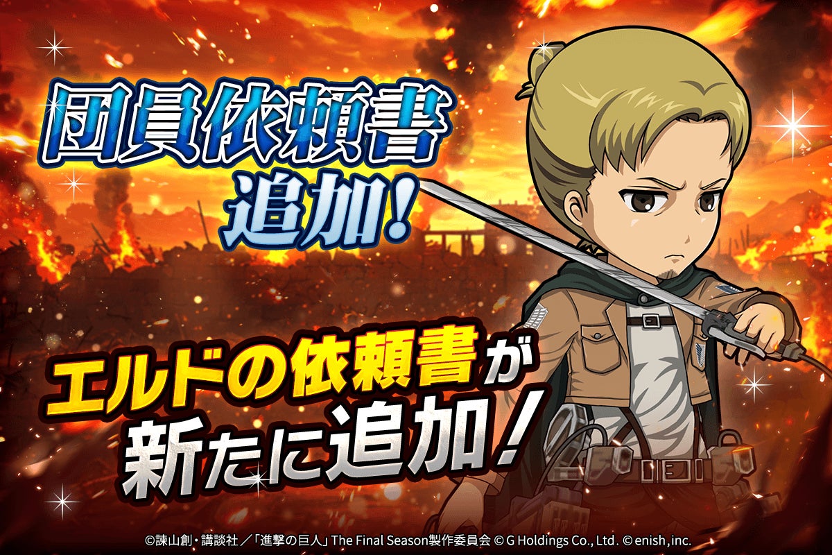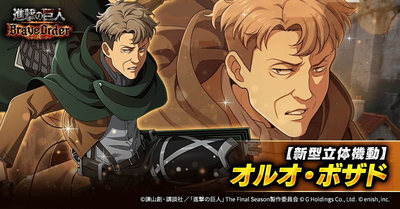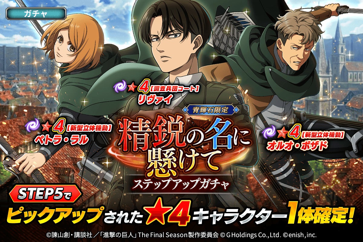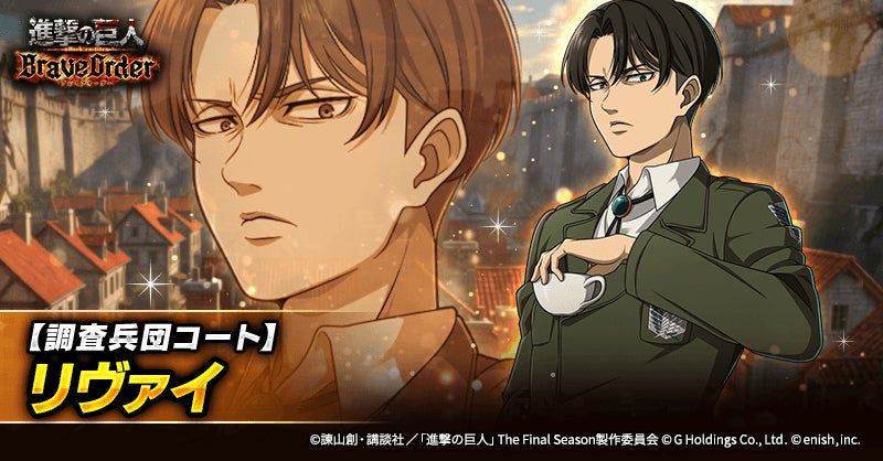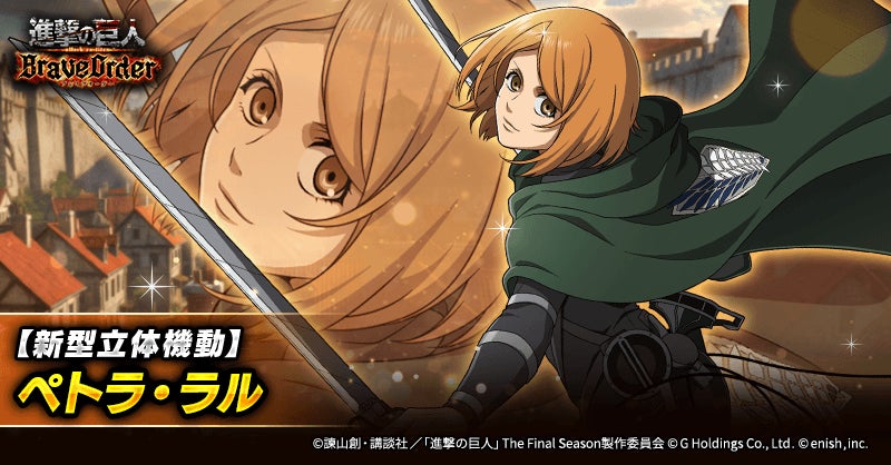 株式会社enish(本社:東京都港区、代表取締役社長:安徳 孝平、以下enish)は、アニメ『進撃の巨人』のスマートフォンゲーム最新作「進撃の巨人Brave Order」にて、2026年4月10日(金)より、新イベントの精鋭の名に懸けてを開催!また、本日より【調査兵団コート】リヴァイ、【新型立体機動】ペトラ・ラル、【新型立体機動】オルオ・ボザドが登場する「精鋭の名に懸けてガチャ」も開催!その他、最新情報はゲーム公式サイト・ゲーム公式X(旧Twitter)アカウントにて随時公開して行きますので、ぜひご覧ください。
