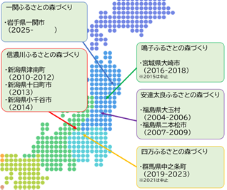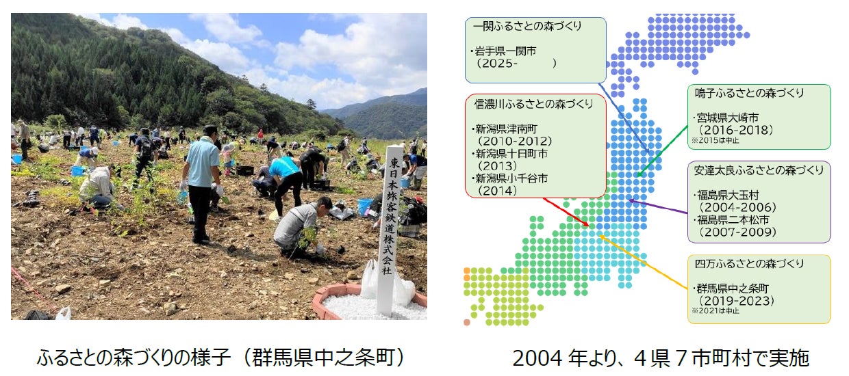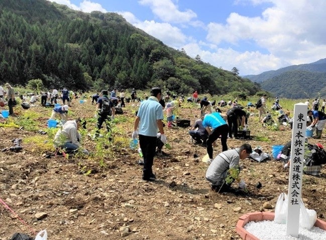 2004年から継続して実施しており、これまでに4県7市町村、参加人数約1万3千人、植樹面積約18.8ha、約18万本の苗木をJR東日本グループ社員及び家族、地域のみなさまと一緒に植樹し、これまでの植樹により年間約430トンのCO2を吸収する樹木を創出しています。2025年度は、新しい開催地となる岩手県一関市で実施する予定です。