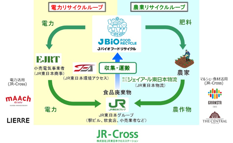 JR東日本グループは、食品廃棄物を「電力」と「農業」でリサイクルする『ダブルリサイクルループ』の取り組みを推進しています。2024年からは株式会社Jバイオフードリサイクル(神奈川県横浜市鶴見区)(以下、「Jバイオ」)および株式会社東北バイオフードリサイクル(宮城県仙台市宮城野区)(以下、「東北バイオ」)で食品廃棄物由来の環境にやさしい電力を、株式会社JR東日本商事が排出元の駅ビルやエキナカ等へ供給し、それを利用することでCO₂排出量削減に貢献する「電力リサイクルループ」と、Jバイオおよび東北バイオで生産された肥料で育成した農作物の販売やJR東日本グループのさまざまな排出元で利用する「農業リサイクルループ」の取り組みの拡大を目指しています。