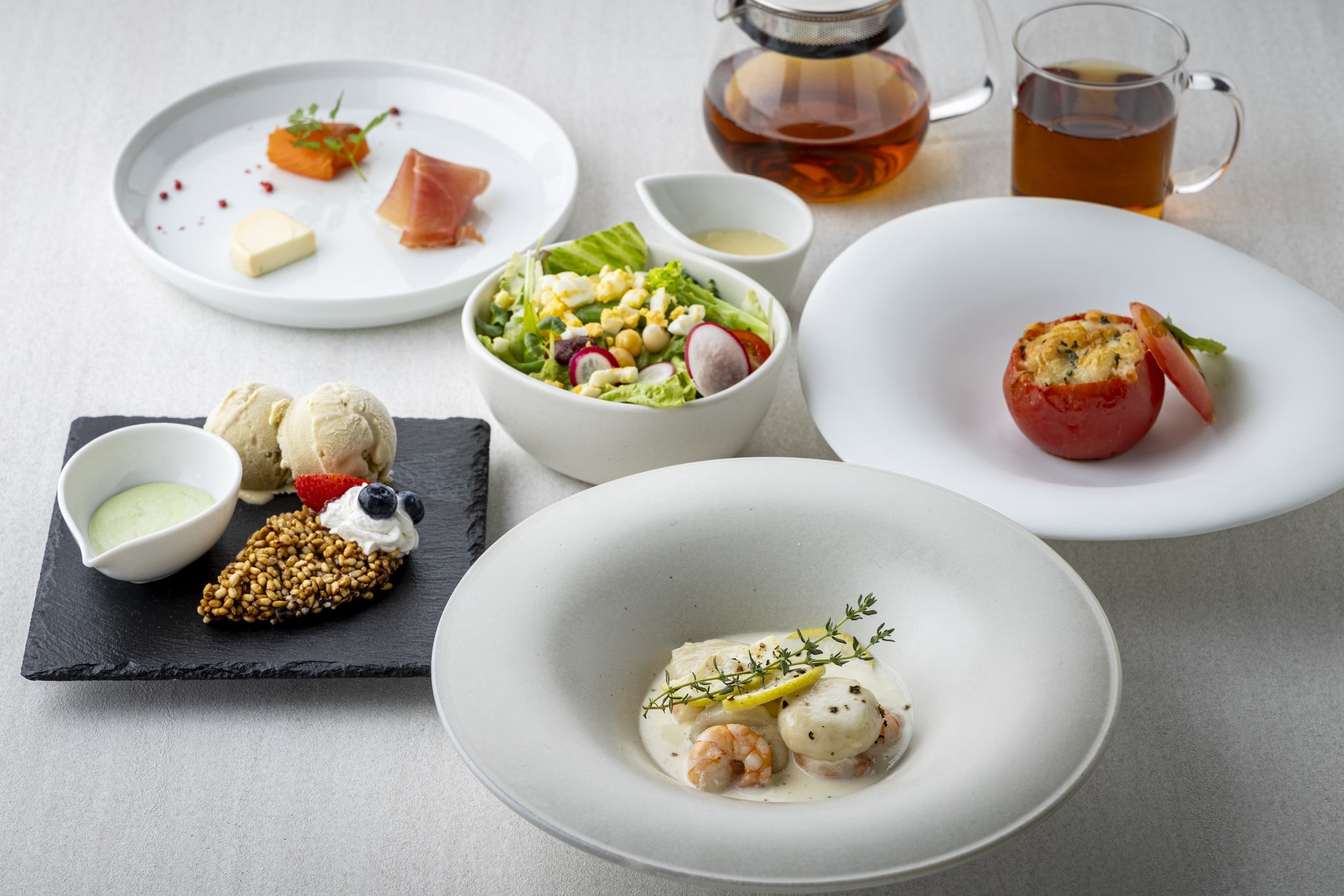 季節の前菜3種盛り、BRM特製サラダ、玄米ニョッキのレモンクリームソース、丸ごとトマトリゾット、