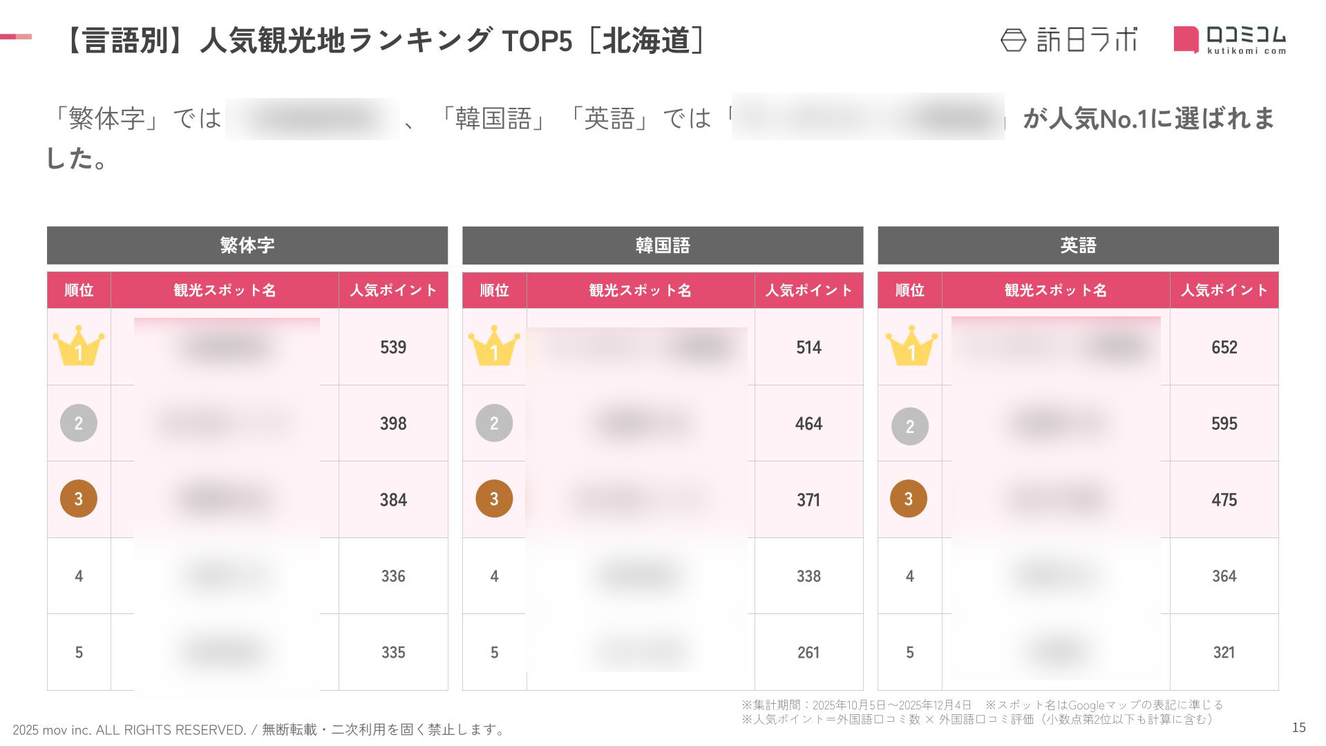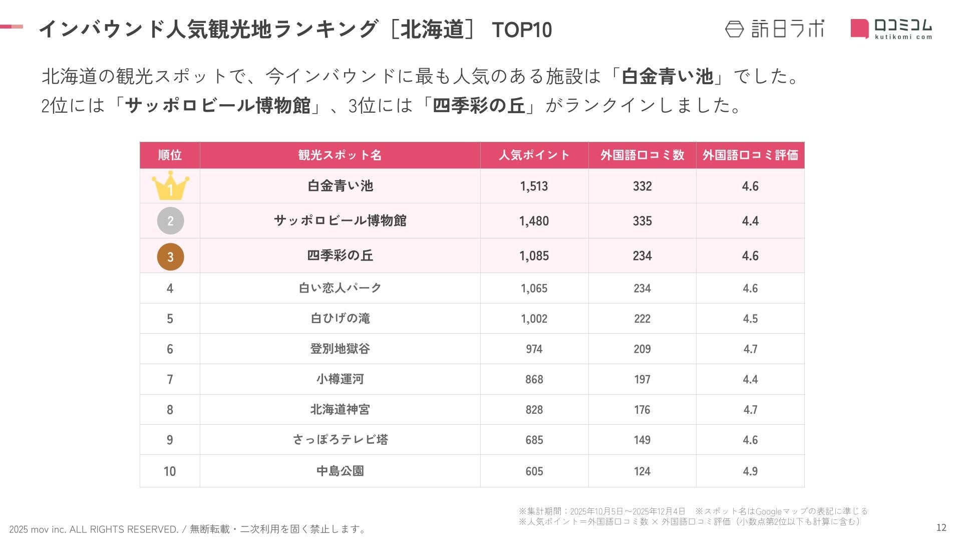 業界最大級のインバウンドビジネスメディア「訪日ラボ」及び 店舗向け集客一元化プラットフォーム「口コミコム」を運営する株式会社mov(代表取締役:渡邊 誠、本社:東京都渋谷区、以下mov)は、北海道の観光地に寄せられた最新の口コミデータから、独自の『インバウンド人気観光地ランキング』を発表しました。