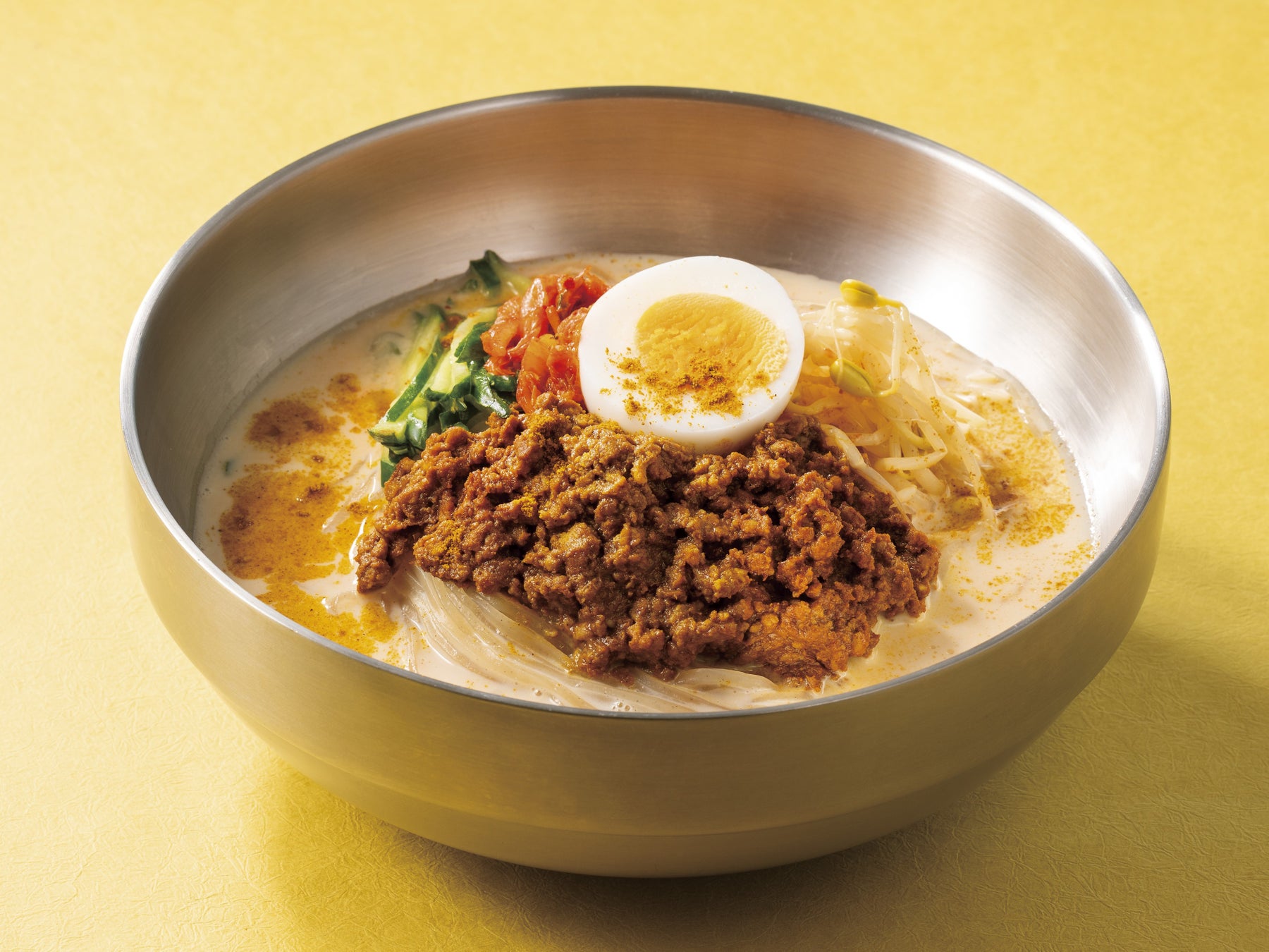期間限定メニューの「カレー豆乳冷麺」は、トヨマサリを使用したまろやかな豆乳スープに、カレー粉とコチュジャンで甘辛く味付けした豚ひき肉、キュウリ、キムチ、もやしのナムル、玉子を盛り付けた、スパイスの香りが食欲をそそる"進化系"冷麺です。