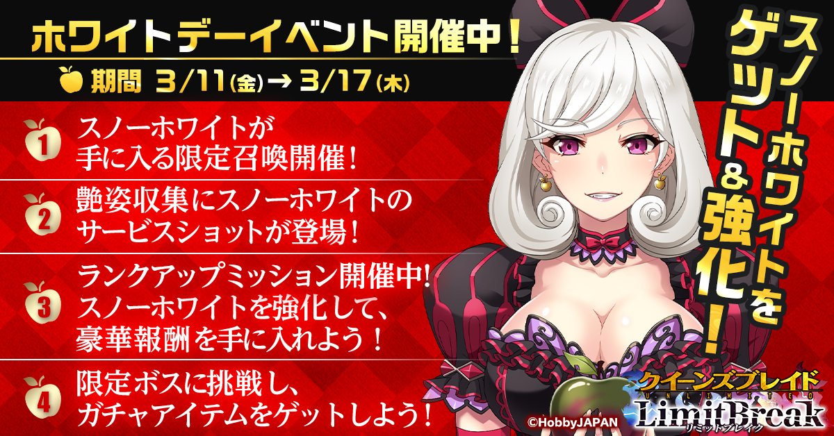 G123『クイーンズブレイドリミットブレイク』新★5美闘士「スノーホワイト」が登場するホワイトデーイベント開催!