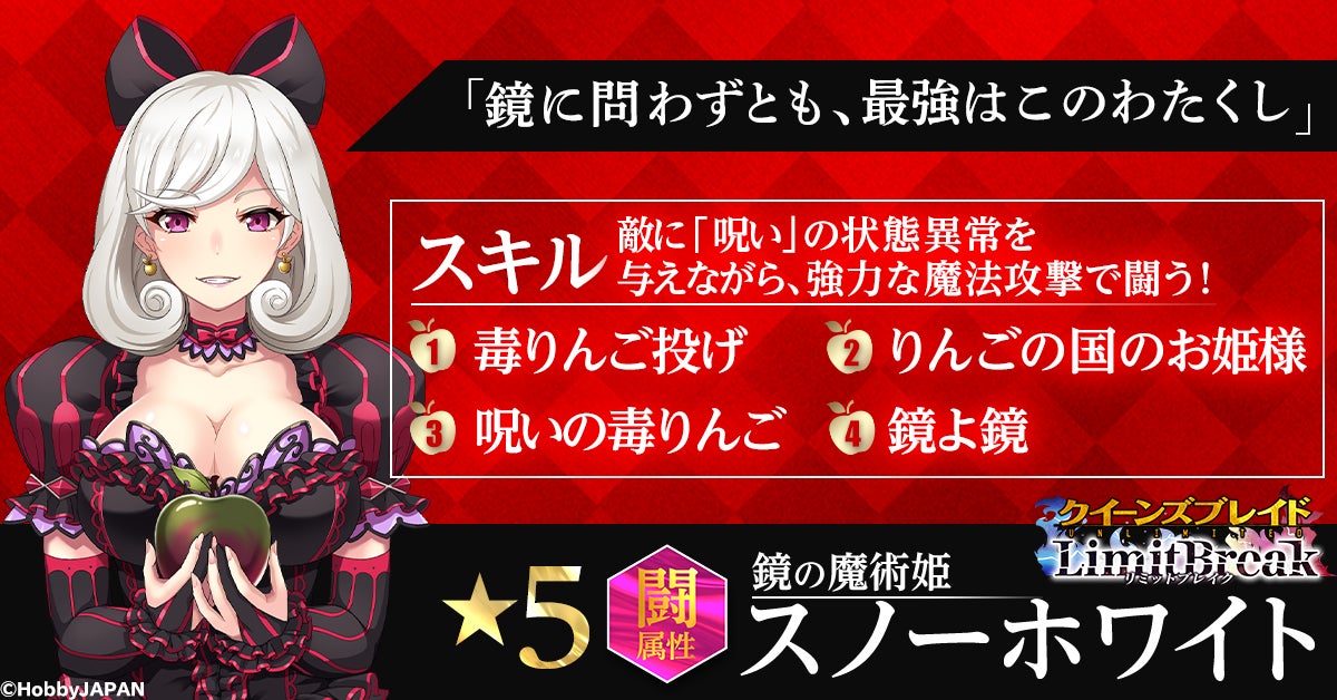 CTW株式会社は、ゲームサービス「G123」にて配信中のHTML5ゲーム『クイーンズブレイドリミットブレイク』(以下クイリミ)にて、新★5美闘士「スノーホワイト」が登場するホワイトデーイベントの開催をお知らせいたします。