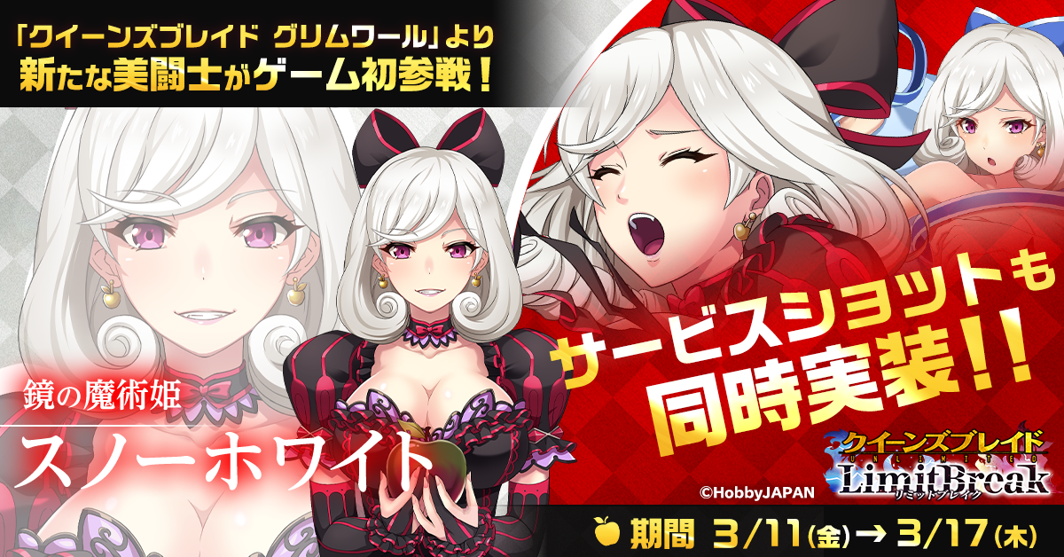 新たな★5美闘士として、「スノーホワイト」が期間限定で登場いたします。スノーホワイトは、「クイーンズブレイド グリムワール」から参戦する初の美闘士となります。さらに、サービスショットも同時に登場するので、この機会をお見逃しなく!