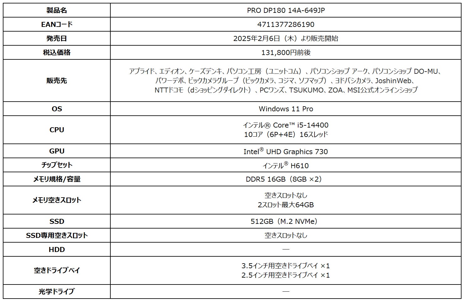 この度、エムエスアイコンピュータージャパン株式会社は2025年2月6日(木)よりビジネス向けデスクトップPCブランド『PRO DP』シリーズより、第14世代インテル® Core™ i5-14400、大容量メモリ、超高速SSDを搭載し、ビジネス用途に最適なWindows 11 Proプリインストール済みモデル「PRO DP180 14A-649JP」が新たにラインナップに加わります。
