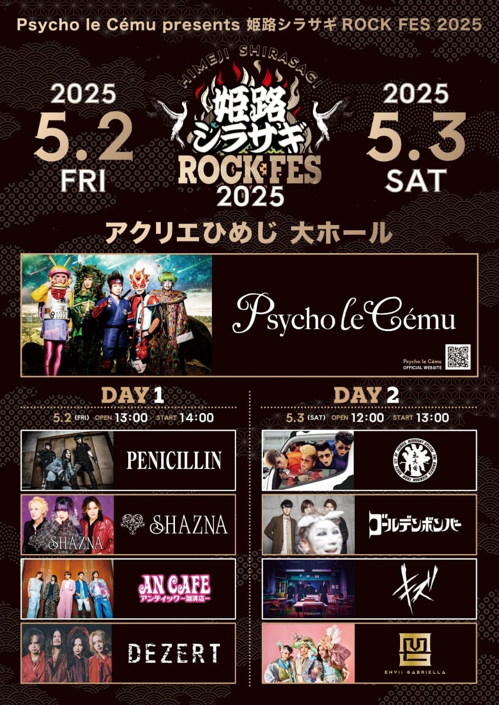 氣志團、ゴールデンボンバー、PENICILLIN、アンティック-珈琲店-ら出演 Psycho le Cému主催「姫路シラサギROCK FES 2025」をニコニコ生放送で独占生中継〈5/2、3開催〉