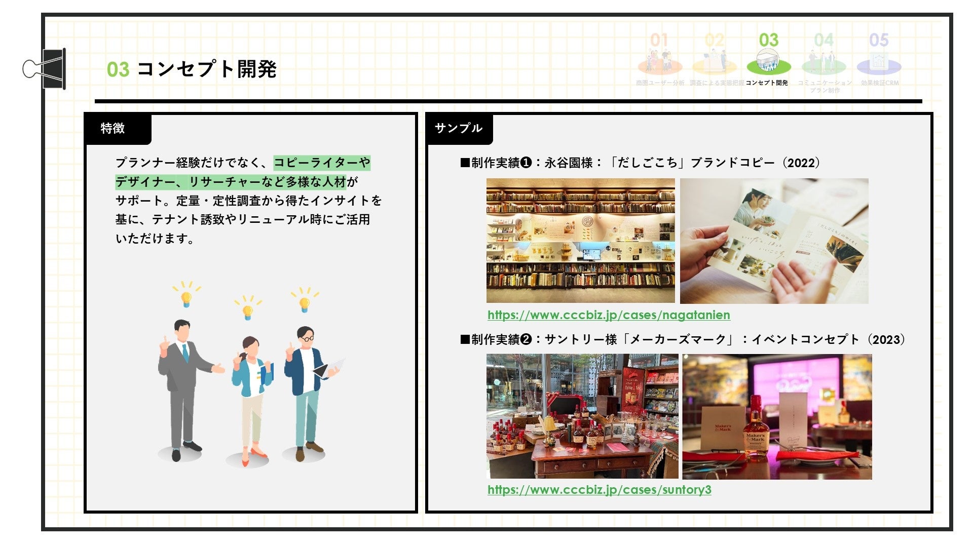 ペルソナ分析により導き出された人物像や消費者ニーズをもとに、対象地域の魅力がより効果的に伝わる、具体的な顧客像に基づいたコンセプト開発を行います。テナント誘致や商業施設リニューアルの指標、イベントや商品開発などに役立てられます。