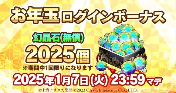ログインすると2025個の幻晶石[無償]がもらえる「お年玉ログインボーナス」や、毎日無料で祈れる「毎日無料 遭逢の願掛け」「毎日無料 追憶の願掛け」など、年末年始のお得なキャンペーンも開催いたします。