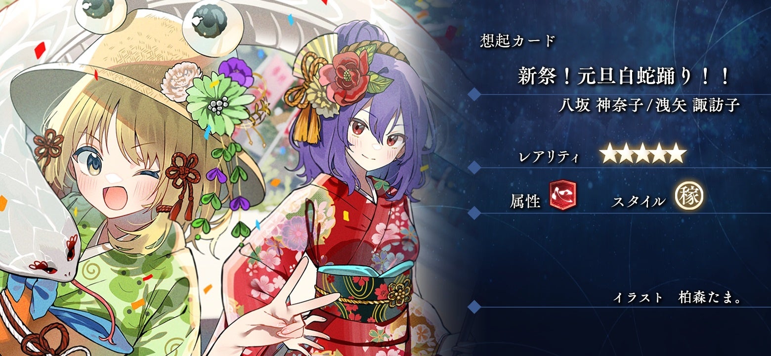 イベントで獲得できる、洩矢諏訪子/八坂神奈子の想起カード『新祭!元旦白蛇踊り!!』は[ブレイク]がアップ、心属性ならさらにアップするパッシブスキル「山の神の神徳」を持っています。