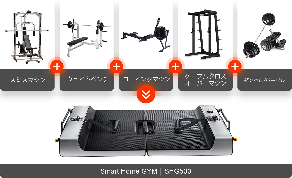 「Smart Home GYM」SHG500は、わずか一畳分と省スペース、アプリ連動により最大120㎏の負荷と200種類以上のメニューを簡単にコントロールでき、5つのマシン機能を1つに集約した次世代トレーニング機器です。