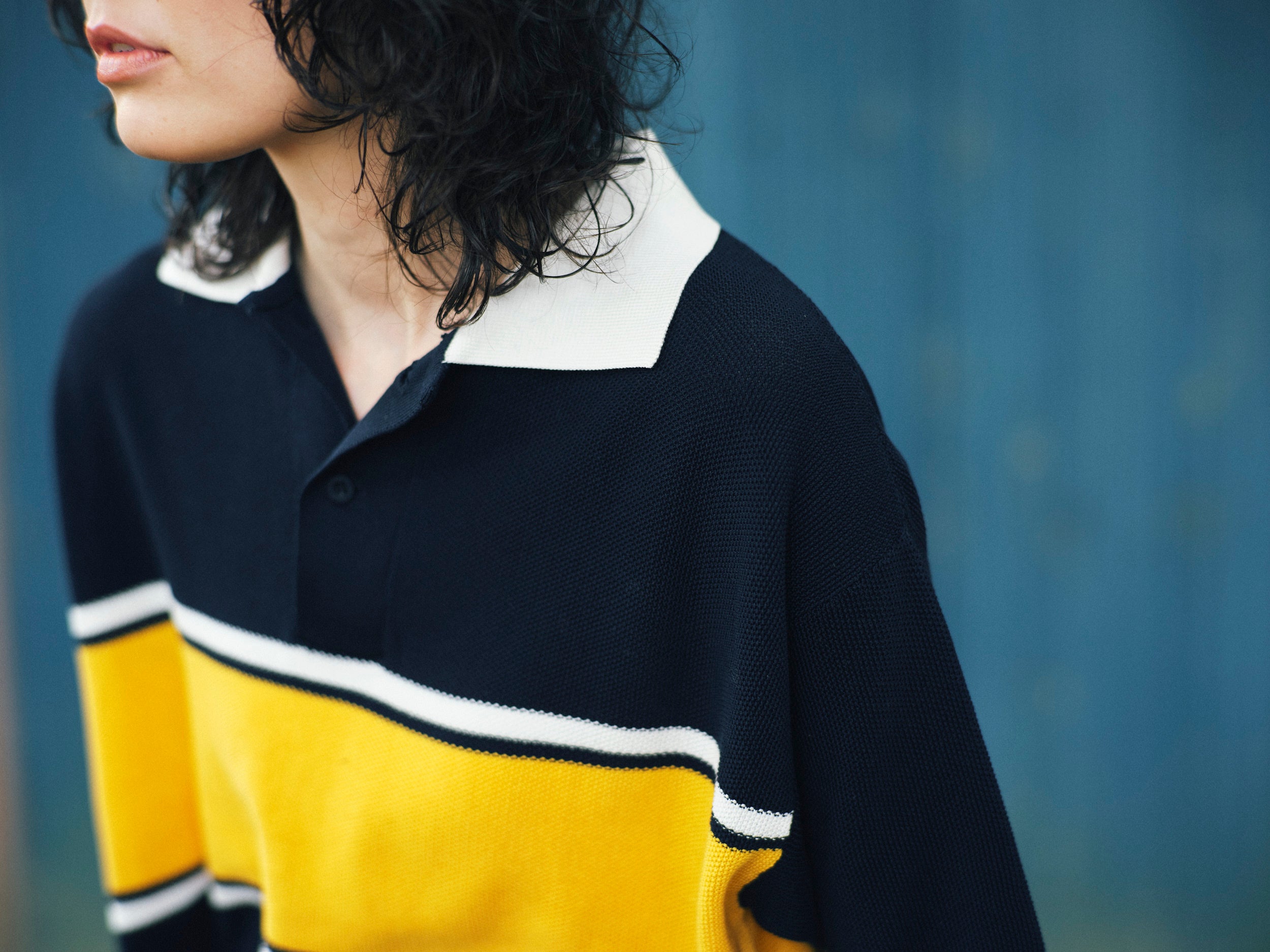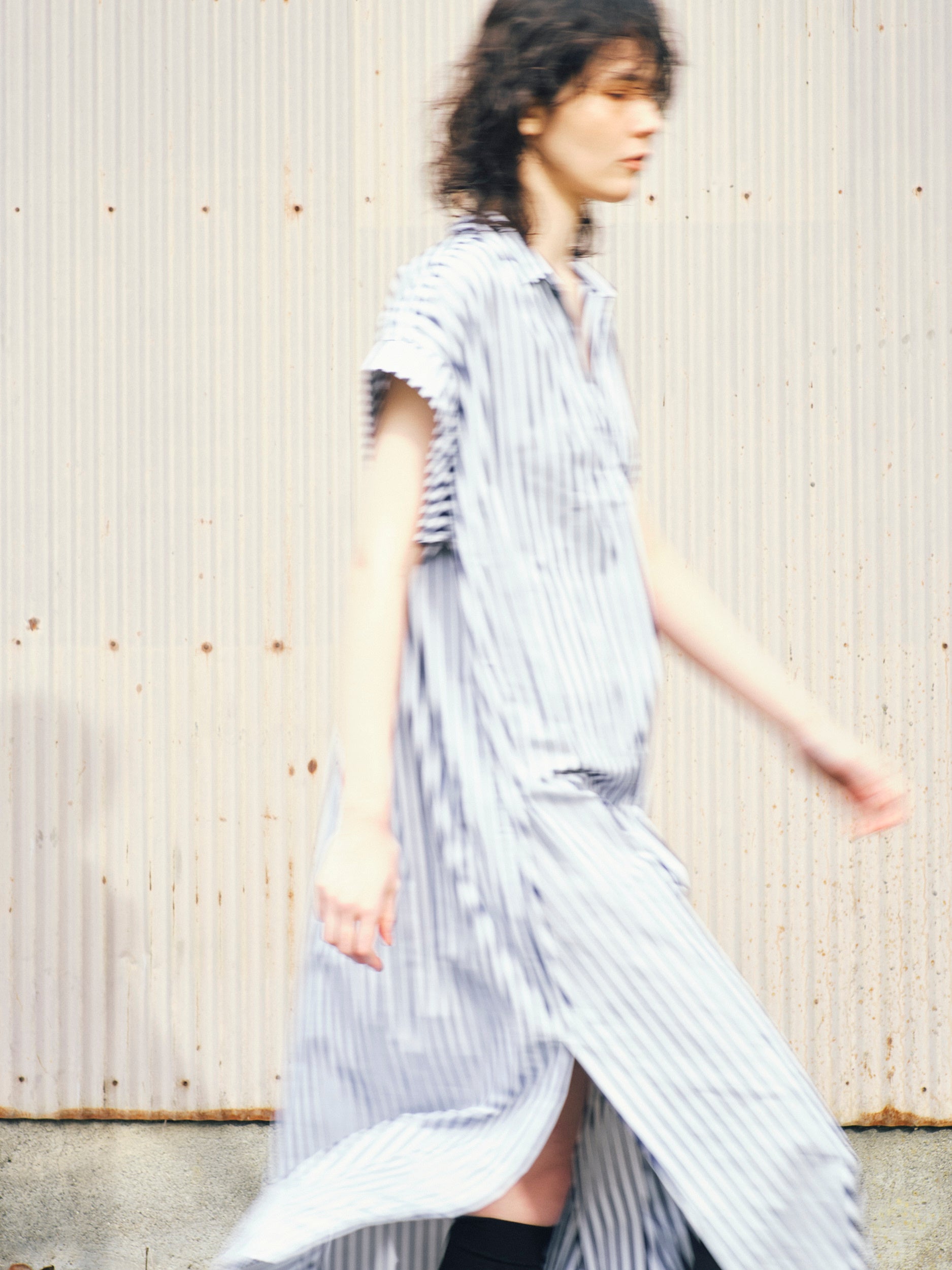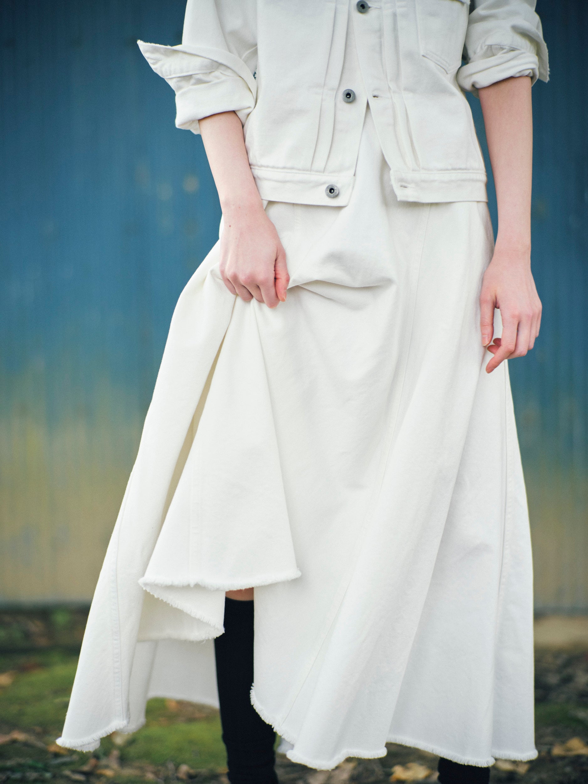 素材の原料からこだわり、製作するユニオン ランチ。今シーズンはフェードブルーとホワイトのデニム素材が秀逸。オーガニックコットンとオーガニックのリサイクルコットンを使用し、染色方法は従来よりもCO2の排出を削減したエコでサステナブルなロープ染色に変えています。アイテムは40年代某デニムブランドのオマージュでCOWBOYジャケット、ヘムが断ち切りでフリンジ調になったフレアスカート、オーバーサイズのワイドパンツを制作。また、極めて細く長い繊維長に加え強度も高いインドの希少繊維スビンコットンや、手積みで収穫されたエジプトのギザコットンをシャツやワンピースに採用。シルクのようにしなやかな落ち感と、高密度で織られた素材の立体感が共存したシルエットに仕上げています。