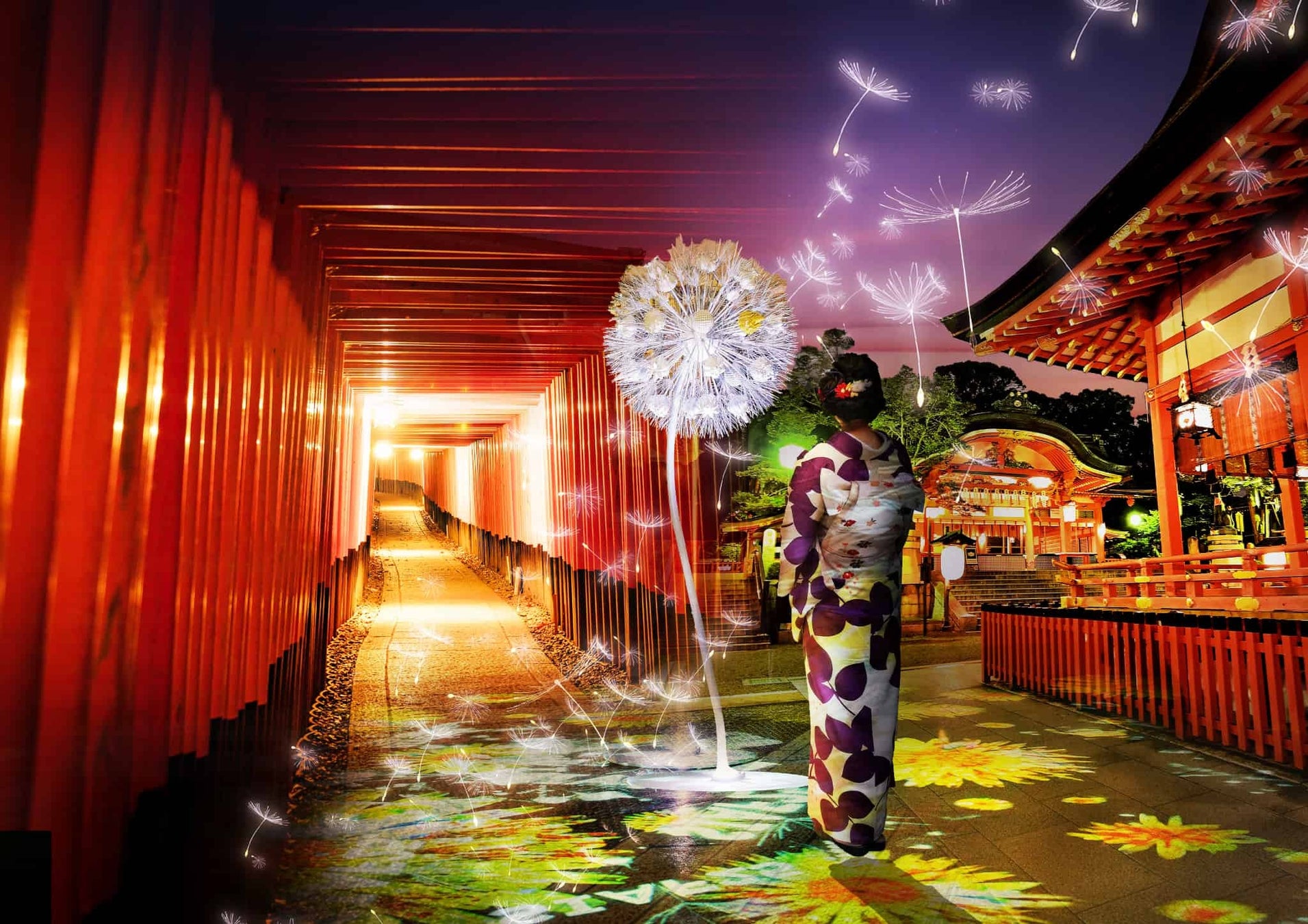 伏見稲荷大社では、日々の御神恩に感謝する神事「宵宮祭」「本宮祭」と連動し、『NAKED GARDEN ONE KYOTO』として初めてアート展示を実施。稲荷小学校の児童が、未来の平和を願いながら描いた作品が奉納され、『DANDELION PROJECT』とともに境内に展示されます。代々受け継がれてきた祈りの場に、現代の子どもたちの祈りが重なり、世代を超えて「平和」を願う光が京都の夏を彩ります。
