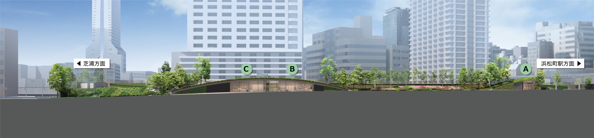 GREEN WALKは浜松町駅や竹芝エリアと、芝浦エリアとの回遊性を高める為に、港区道である歩行者専用道路を中心に、植栽や水景が整備されたアプローチです。この度、開通するのは浜松町駅南口から本プロジェクト敷地南側にかけての区間となります。今後も整備を続け、浜松町駅北口・竹芝方面までの伸長を予定しております。