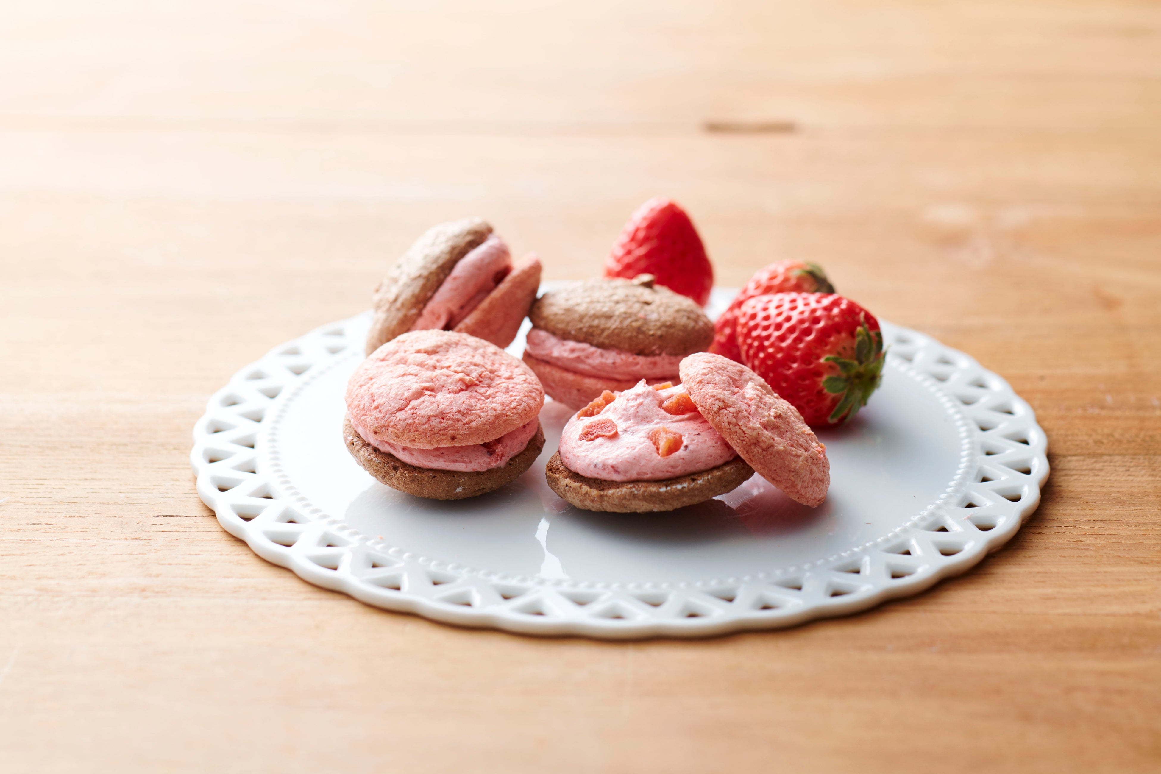 ほんのり甘酸っぱい苺果肉入りの苺チョコクリームをふうわり食感の【苺】と【ショコラ】のダックワーズ生地でサンド。苺ケーキのような味わいです。