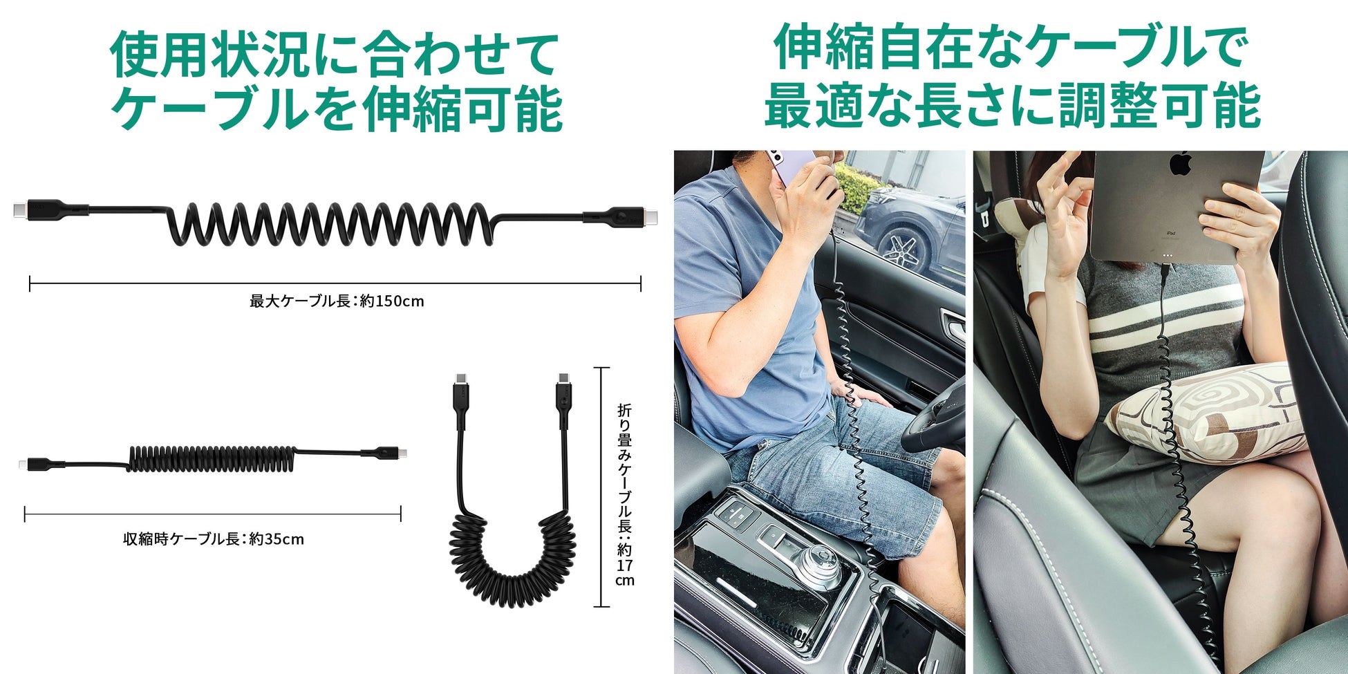 ケーブルを伸ばして使用したい場面では、最大で約150cmまで伸びるコイル形状のケーブル!