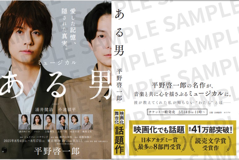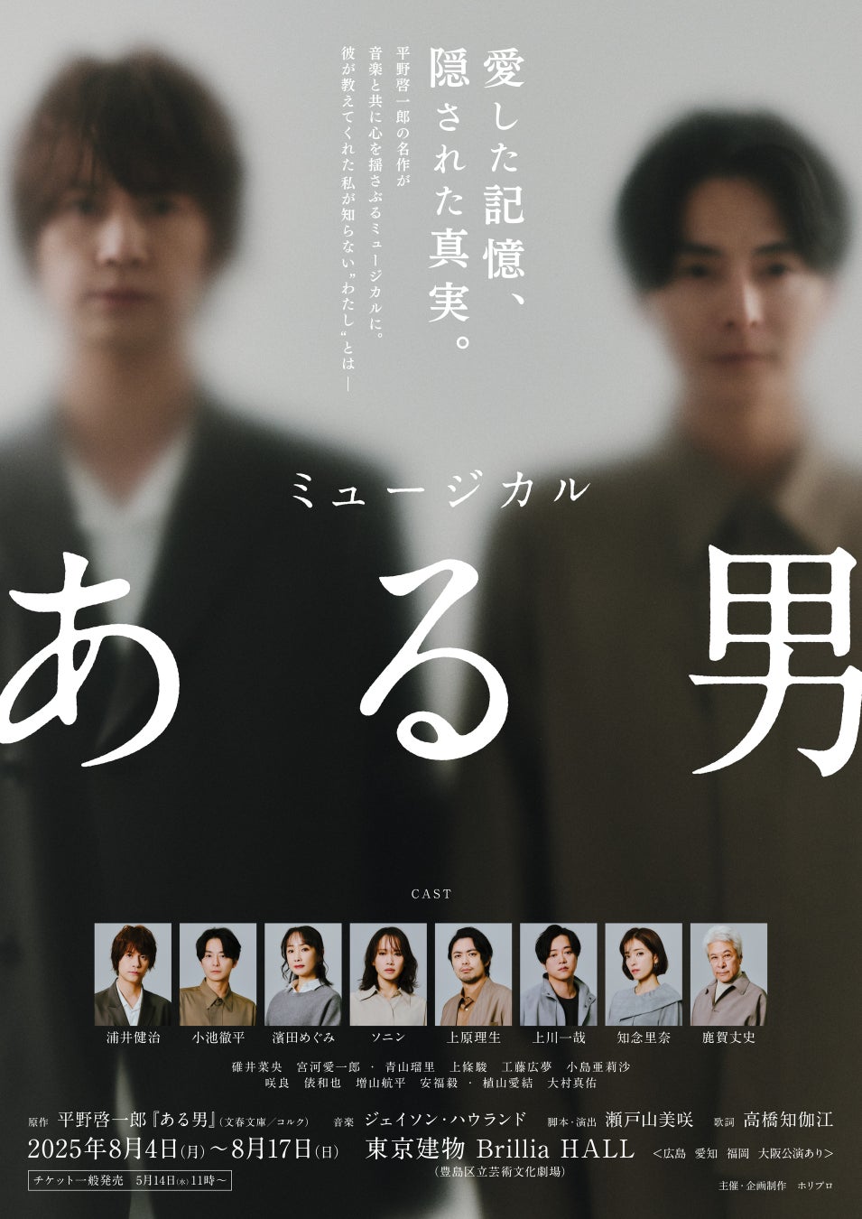 2025年8月に東京建物 Brillia HALL(豊島区立芸術文化劇場)にて開幕するミュージカル『ある男』の製作発表が5月1日(木)に開催された。当初から発表されていた浦井健治・小池徹平・濱田めぐみ・ソニン・上原理生・上川一哉・知念里奈・鹿賀丈史・瀬戸山美咲(脚本・演出)9名に加えて、原作小説「ある男」の著者である平野啓一郎が登壇し、それぞれが世界初オリジナルミュージカル化への意気込みを語った。さらに、抽選で招待した一般オーディエンス250名に、劇中曲より一幕ラストのデュエットナンバー「暗闇の中へ」を初披露。東京公演チケットはホリプロステージにて5月11日(日)まで先着先行中。