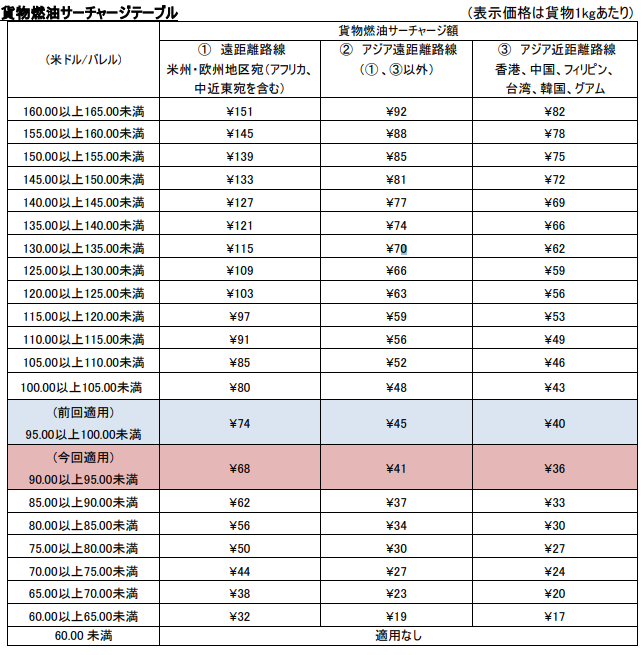 JALは日本発国際貨物燃油サーチャージの改定時期を年12回(毎月)としており、また、各月の貨物燃油サーチャージ額は「シンガポールで取り引きされるジェット燃油(ケロシン)価格の前々月の平均値」を燃油指標価格として、2024年4月より導入した以下テーブルに従いサーチャージ額を決定します。