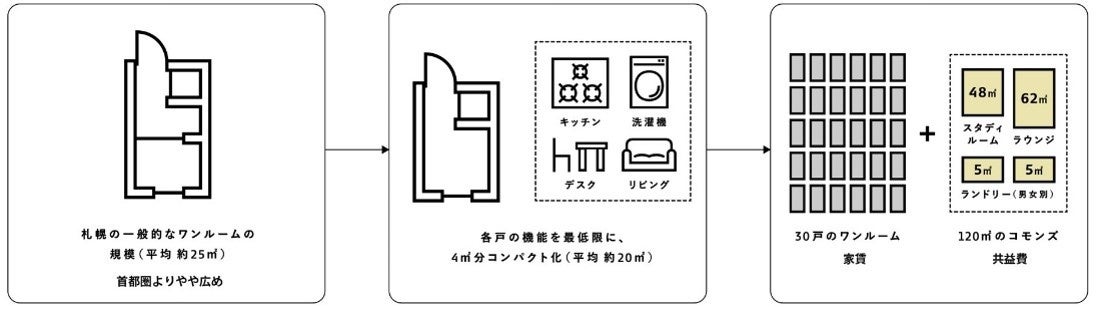 北海道大学近くの30戸のコモンスペース付アパートメント。水回りをコンパクトにすることで各住戸から4㎡のスペースを生み出し、共益費を設定したコモンスペース=コモンズを創出している。建築家が企画段階から参加しプランを作成しながら、近隣物件と⽐較したマーケティング・家賃設定や、融資の返済額を踏まえたキャッシュフローの作成、銀⾏折衝が行われた。さらに竣⼯後も建築家が管理会社と協⼒して運営に携わり、⻑期的スパンでコミュニティ・デザインを実践し、サロンのような空間に育てることを目指している。