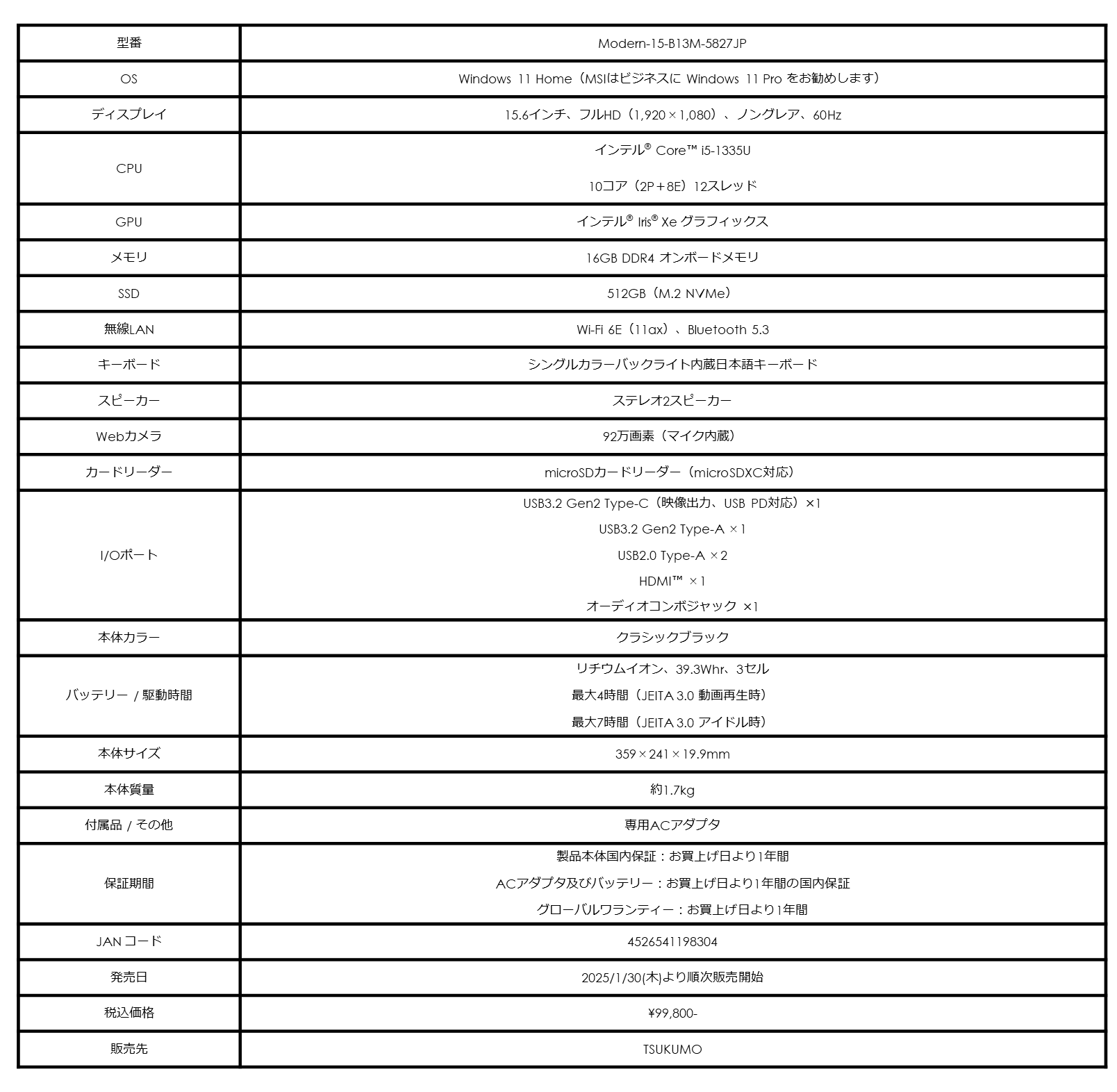 この度、エムエスアイコンピュータージャパン株式会社は、15.6インチ大画面ディスプレイを備えつつ、Core™ i5、メモリ 16GB、SSD 512GBを採用し、税込10万円以下のリーズナブルな価格を実現したビジネスノートPCのTSUKUMO限定モデル「Modern-15-B13M-5827JP」を2025年1月30日(木)より発売いたします。