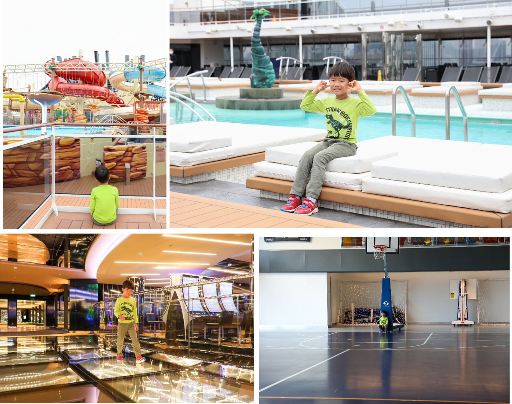 操縦室見学の後は、屋外ウォーターパークやバスケットコートなど、まるで一つの街のような豪華客船の内部を探検しました。