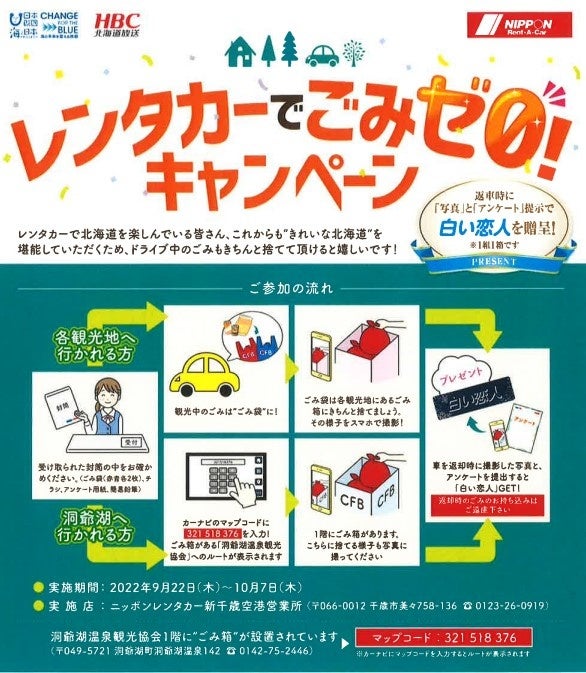 | キャンペーンの流れ | 1.レンタカーを借りる際に封筒を受け取る (ごみ袋4枚、チラシ、アンケート、簡易鉛筆) 2.観光中に出たごみや、拾ったごみをごみ袋に! 3.ごみ袋をきちんとごみ箱に捨て、その様子をスマホなどで写真撮影 4.返却時に受付で写真を見せてアンケートを提出すると「白い恋人」を一組ひと箱をプレゼント! |
