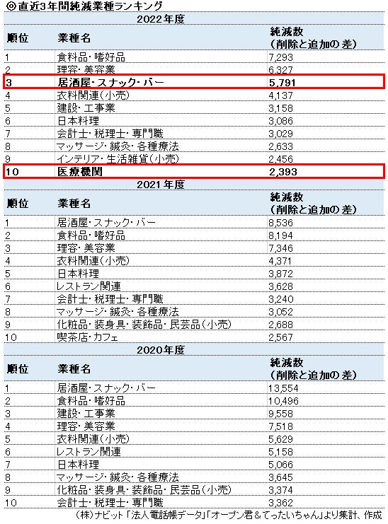 『直近3年間で増えた業種、減った業種ランキング』~福祉関連施設の大幅な増加、医療機関の減少~