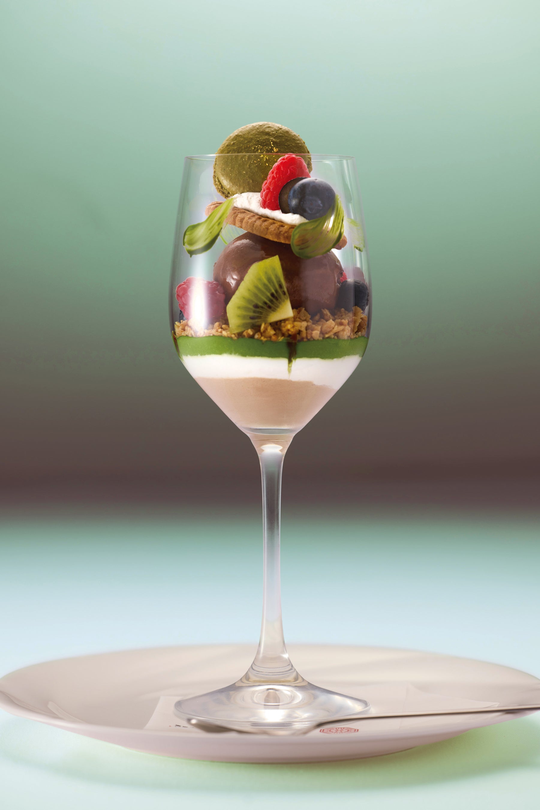 展覧会のイメージカラーであるグリーンを、抹茶マカロン・ピスタチオソースで表現し、濃厚なチョコレートアイスクリームとフルーツを合わせました。