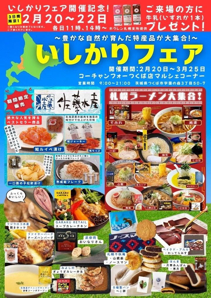 北海道石狩振興局では、首都圏における石狩地域の「食」と「観光」のさらなる認知度向上を促すため、食関連事業者の皆さまや市町村等のご協力のもと、本年度も、(株)リラィアブルの「コーチャンフォー若葉台店」(東京都稲城市)と「コーチャンフォーつくば店」(茨城県つくば市)の2箇所で、「北海道いしかりフェア」(首都圏)を同時開催します。