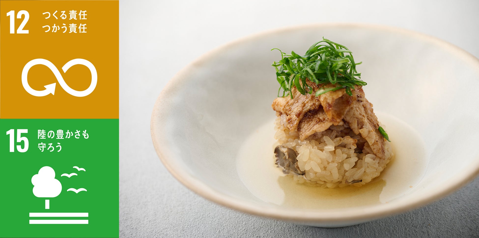 ・梅小路ポテル京都では、夜のコースメニューの中で、このコーヒー残渣から育てられたヒラタケを使った特別メニュー「キノコ革命さんのヒラタケご飯 黒豚胡麻和えのぶぶ漬け」を提供しています。風味も味も濃い!と感想が寄せられる、美味しいヒラタケです。