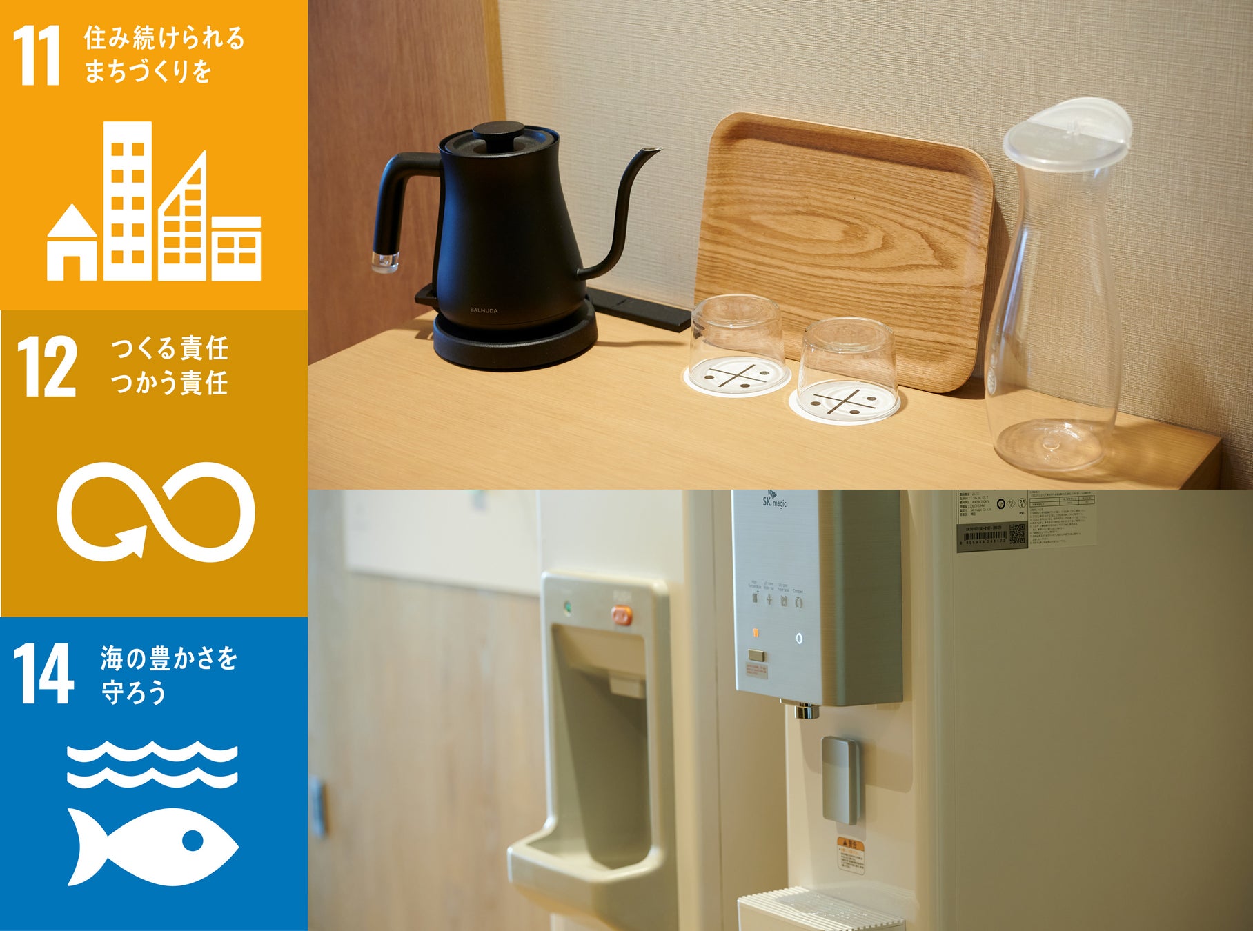 ポテルでは、食材廃棄削減や資源循環プロジェクト以外にも、環境への負荷軽減を目指したさまざまな取り組みを行っています。2020年の新型コロナウイルス感染拡大により来館者数が減少し、事業全体のコスト見直しが必要となったことをきっかけに、館内に無料のウォーターサーバーを導入しました。また、これまで宿泊者サービスとして提供していたペットボトルのミネラルウォーターの配布を廃止し、プラスチックごみの削減と経費削減を同時に実現しています。各フロアにウォーターサーバーを設置(水道水直結タイプ)、また、客室にファミリーにも対応できる大き目のウォーターピッチャーを常備。各フロアのウォーターサーバーから随時給水が可能です。