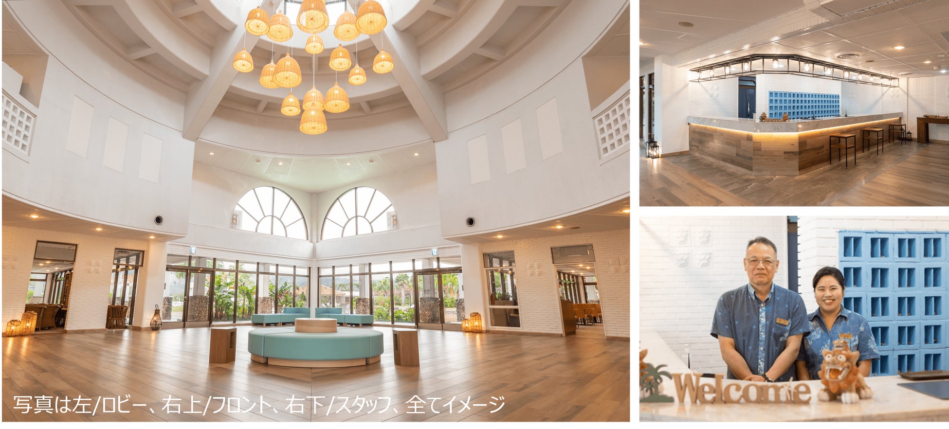 リゾートホテル久米アイランドは、2024年3月末にて、ロビーとフロントのリニューアル工事が終了しました。白を基調としたロビーは、天井が高く開放感抜群で、久米島の自然のぬくもりを感じていただける木目調のフロアを採用しました。フロントは、久米島の青い空と海をイメージし、青を基調としたデザインにしました。