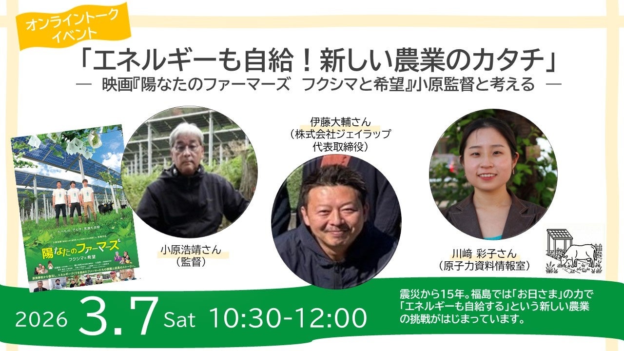 パルシステム連合会(本部:東京都新宿区、理事長:渋澤温之)は3月7日(土)10時30分から12時まで、オンライントークイベント「エネルギーも自給!新しい農業のカタチ」を開催します。福島での営農型太陽光発電「ソーラーシェアリング」の挑戦を追ったドキュメンタリー映画の監督や実践者が、再生可能エネルギーによる発電と持続可能な農業の可能性を語り合います。原発事故から15年を迎える今、被災地の現状を知り、参加者とともに私たちができることを考えます。