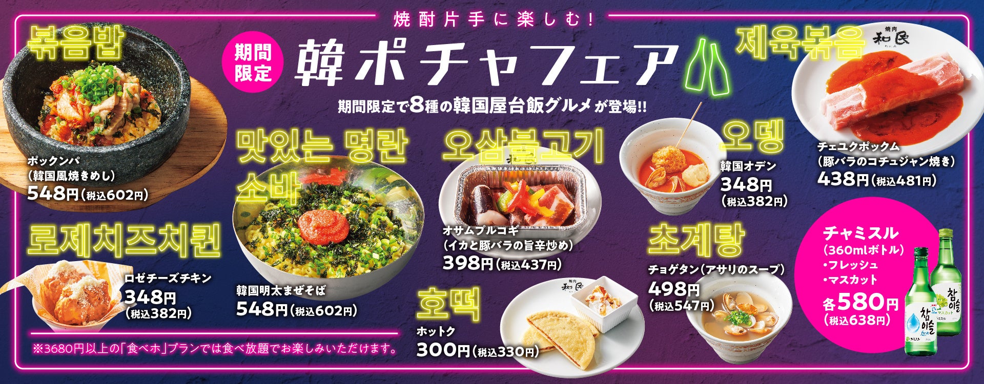 「焼肉の和民」では、2024年1月24日(水)から期間限定で「韓ポチャフェア」として、新たに8種の新メニューが登場します。新しく登場する「ポックンパ」「チョゲタン」「チェユクポックム」「ロゼチーズチキン」「韓国明太まぜそば」「韓国オデン」「オサムプルコギ」「ホットク」はそれぞれ、単品販売はもちろん食べ放題でもお楽しみいただくことが可能で、日本でも人気な韓国の代表的な焼酎「チャミスル」を飲みながら楽しめること間違いなしのラインナップとなっております。