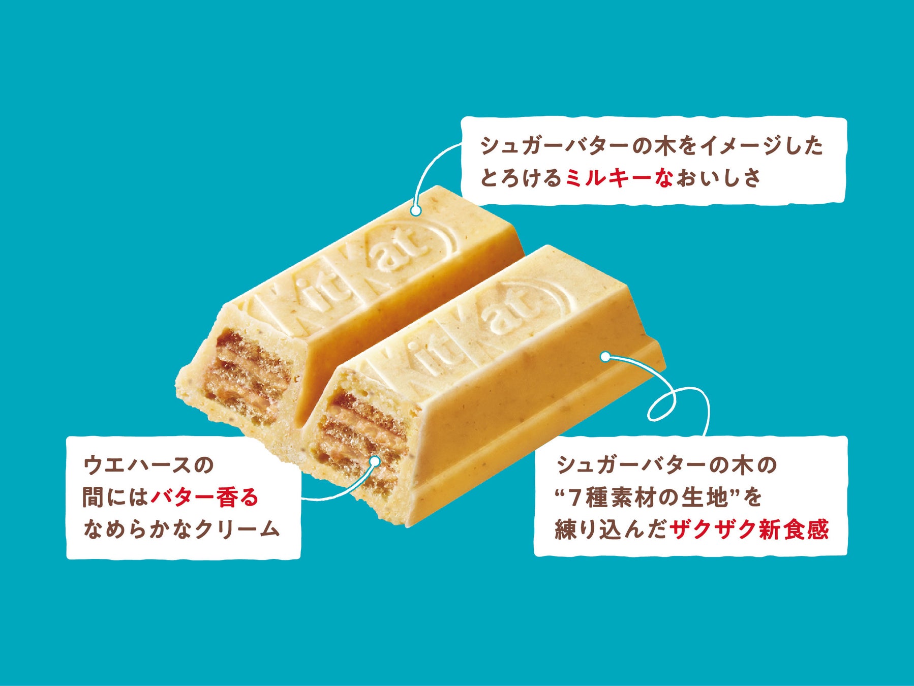 本製品では、小麦粉・小麦全粒粉・ライ麦・酵母・コーングリッツ・からす麦・パン粉7種の素材からなる「シュガーバターの木」特製シリアル生地を練りこんだザクザク新食感を楽しむことできます。またウエハース層間には、「シュガーバターの木」ならではのバターの風味を表現した特製クリームを挟むことで、食べ進める度に、ジュワッと広がるバターの風味も「キットカット」で再現しています。