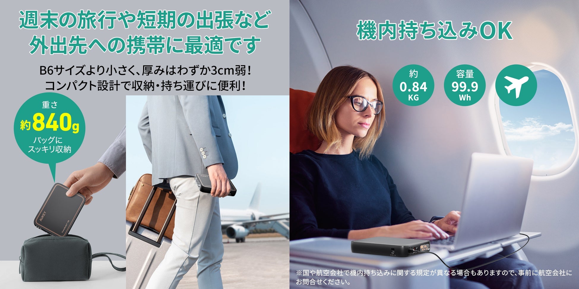 本体のサイズはB6サイズよりも小さく、厚みはわずか3cm弱と超コンパクト設計で収納・持ち運びに便利です。電源が取れない外出先でもノートPCを接続すれば電源の確保が可能です。飛行機内への持ち込みも可能※で、どこにでも気軽に携帯できます。