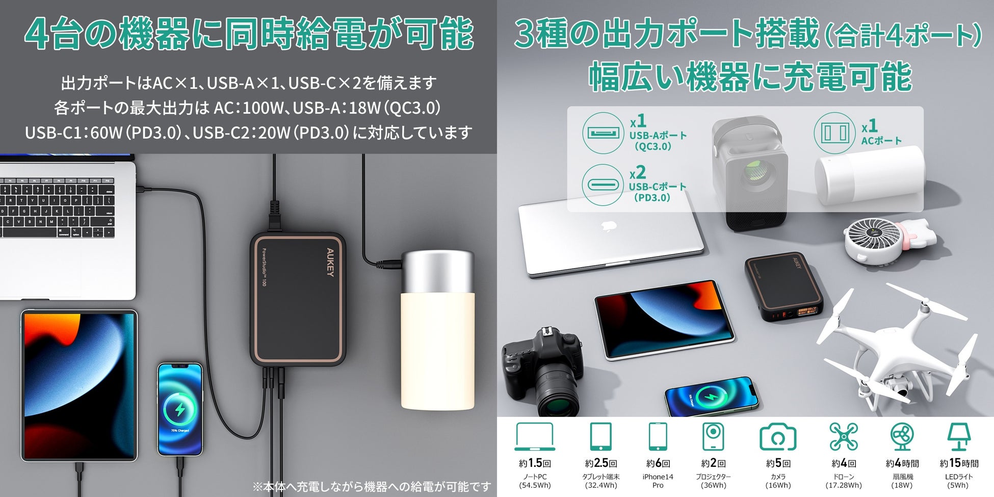 Aukeyの「PowerStudio™ 100」は、4つの出力ポート(AC×1、USB-A×1、USB-C×2)を備え、4台の機器への同時充電が可能!パススルー充電機能を備え、本体を充電しながら機器への給電が可能!小型ながら27,000mAhの大容量。さまざまな機器の電源に使用できます。