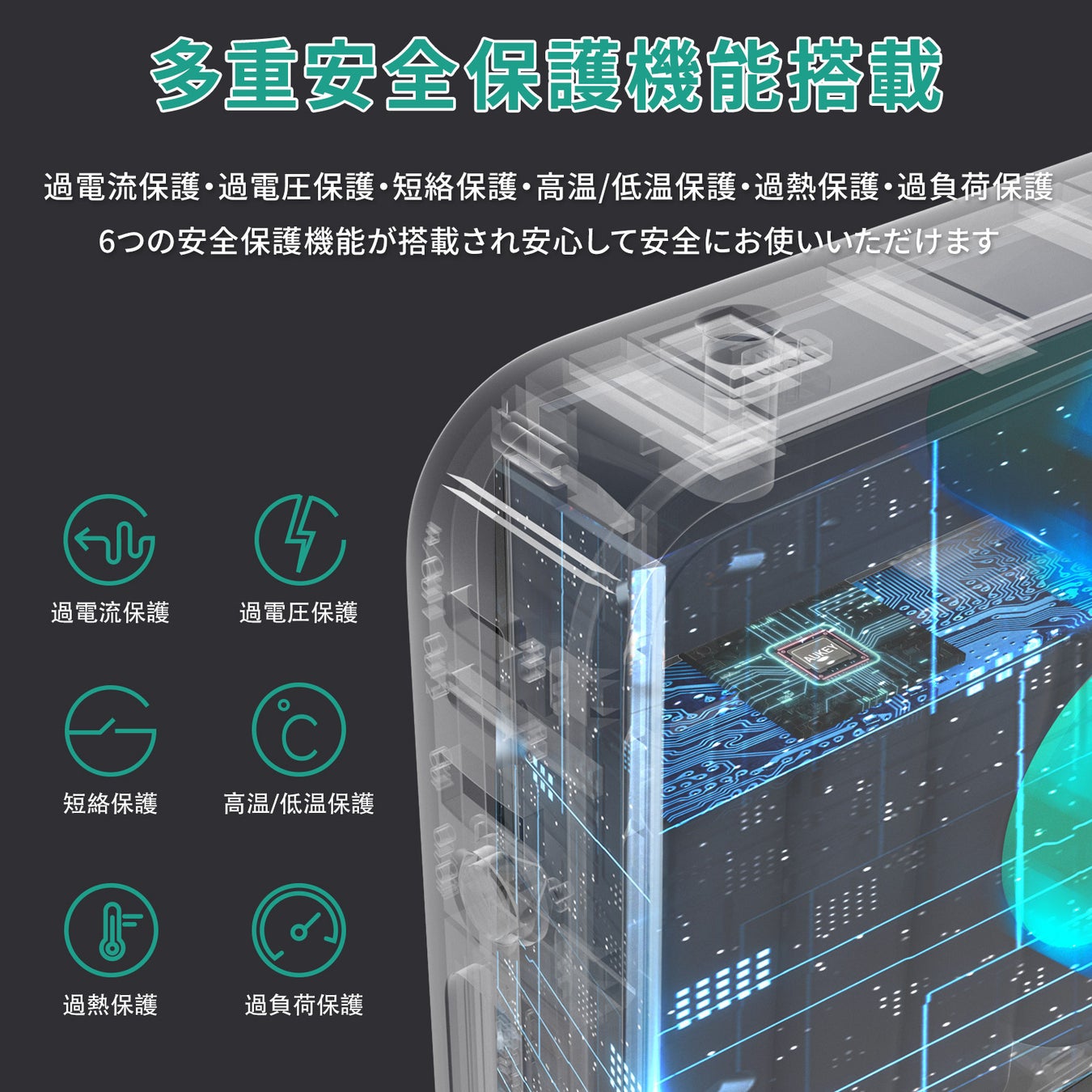 過電流/過電圧/短絡/高温・低温/過熱/過負荷を検知し回路を保護する多重安全保護機能が搭載され、安心して安全にご使用いただけます。