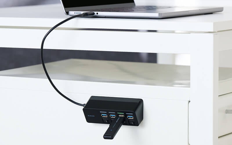 しっかりと固定できる強力マグネットを装備していて、スチール製のデスクなどに固定してぐらつかずに抜き挿しでき、省スペースで使用できます。